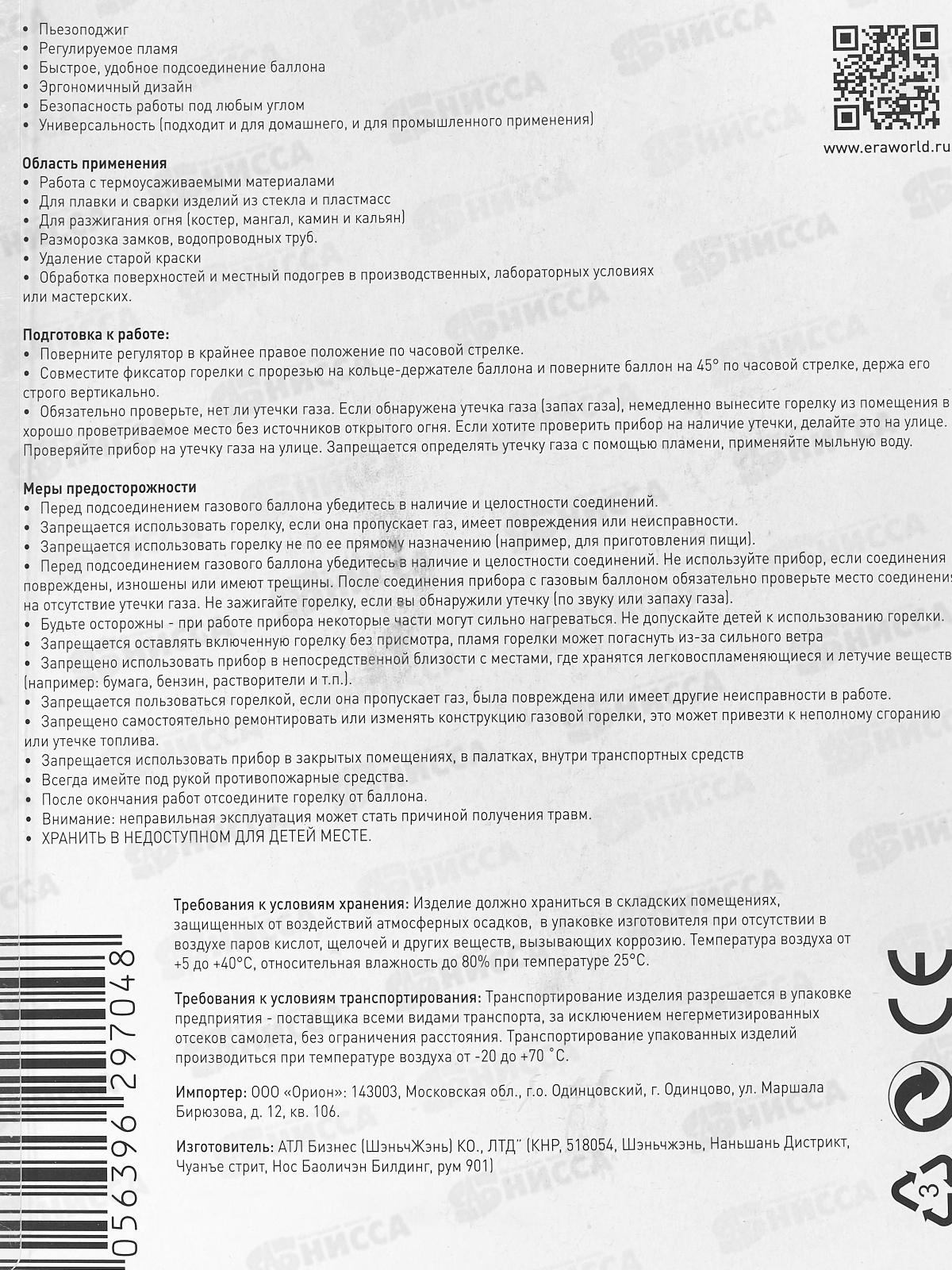 Горелка газовая ЭРА GB-03P с пьезоподжигом установка на баллон *10/100