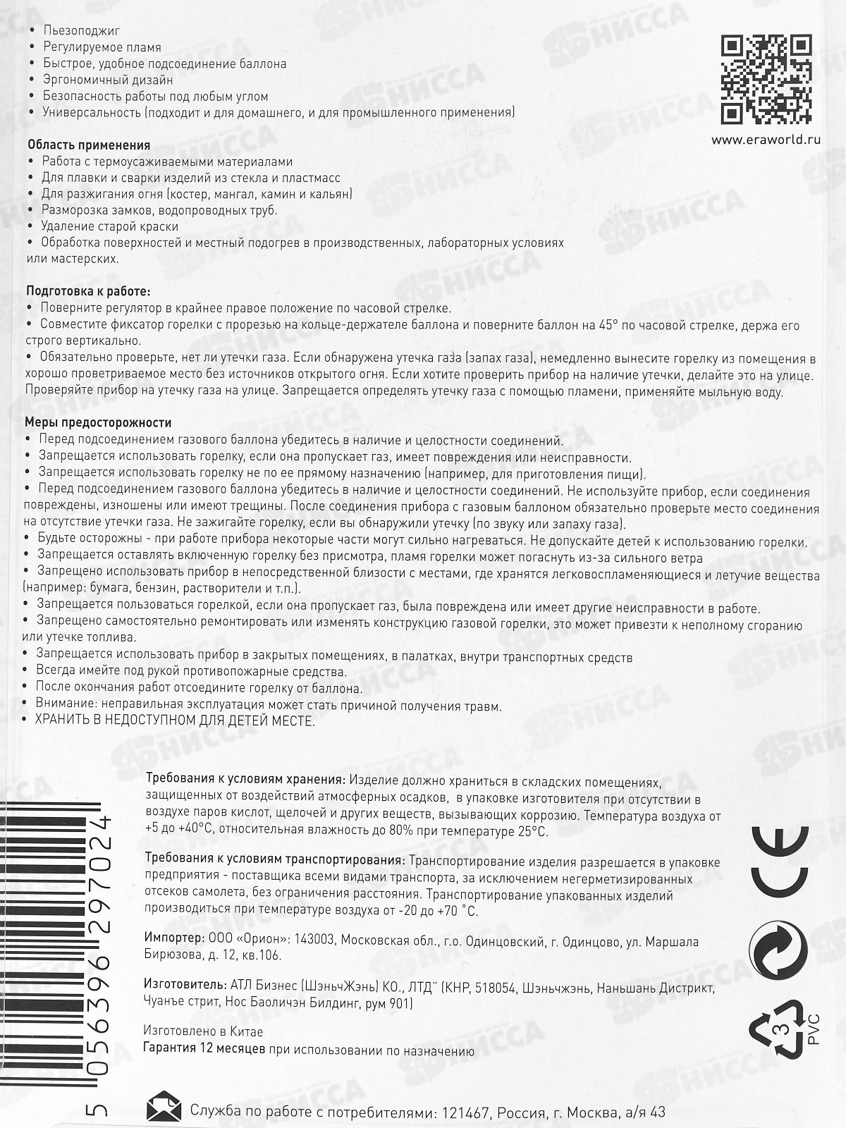 Горелка газовая ЭРА GB-02P с пьезоподжигом установка на баллон *10/100