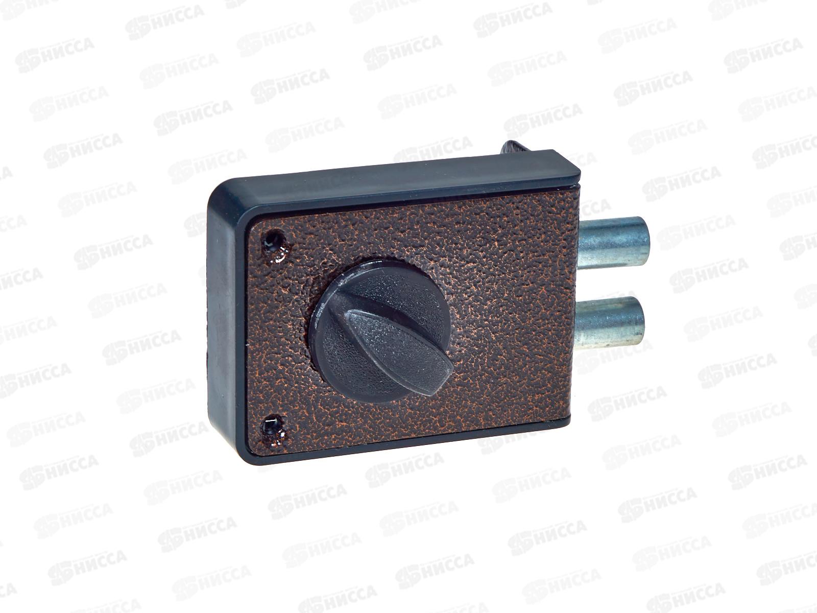 Замок накладной цилиндровый с вертушкой. Предназначен для установки на деревянные двери. Засов из двух цилиндрических ригелей диаметром 14 мм, с максимальным вылетом 25 мм. Удаление ключевого отверстия - 60 мм. Габариты замка - 100х75х24,5 мм. Комплектация - 4 ключей, запорная планка, накладка. Закрывание и открывание замка изнутри производится ручкой, снаружи ключом. Корпус из ударопрочного пластика со стальной пластиной.