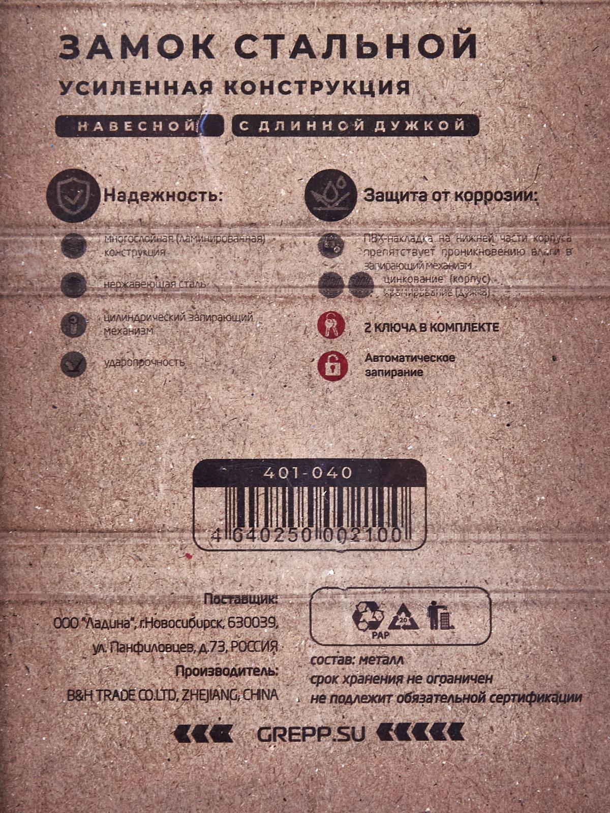Замок навесной "GREPP" сталь 40мм с длинной душкой 401-040 *12/72