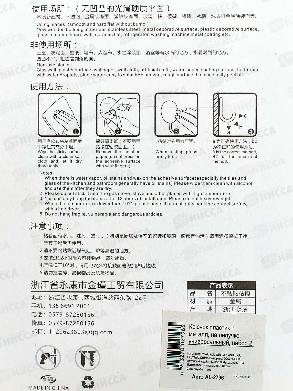 Крючок пластик+металл на липучке, универсальный, набор 2 шт., AL-2796 *240