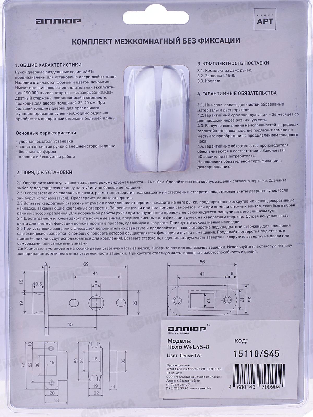 Ручки для дверей Аллюр Поло W+L45-8 матовый белый (комплект) *20 668