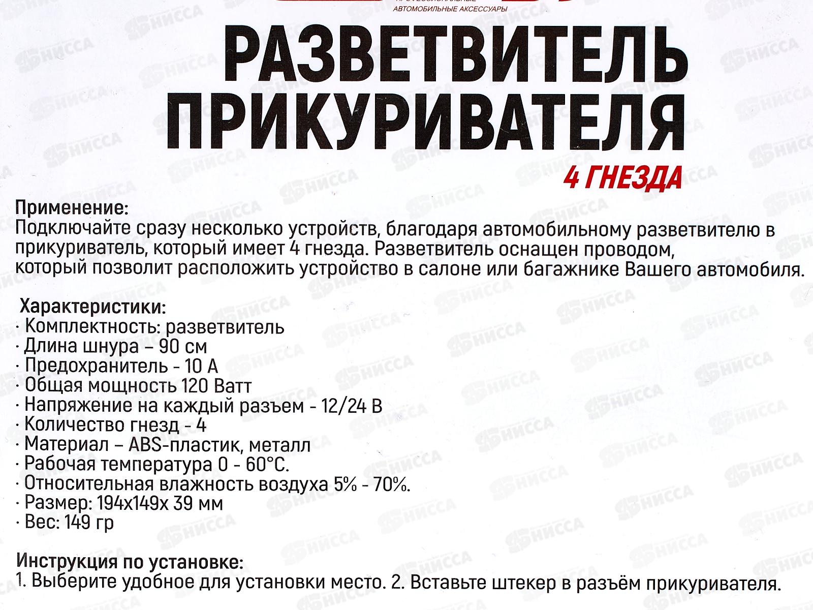 Разветвитель прикуривателя 4 гнезда 12/24V SKYWAY - подключайте сразу несколько устройств благодаря автомобильному разветвителю в прикуриватель, который имеет 4 гнезда. Разветвитель с длинным прямым проводом, который позволяет дотянуться до багажника и удобно расположиться на заднем сиденье. Питается от бортовой сети с напряжением 12 или 24 Вольт.