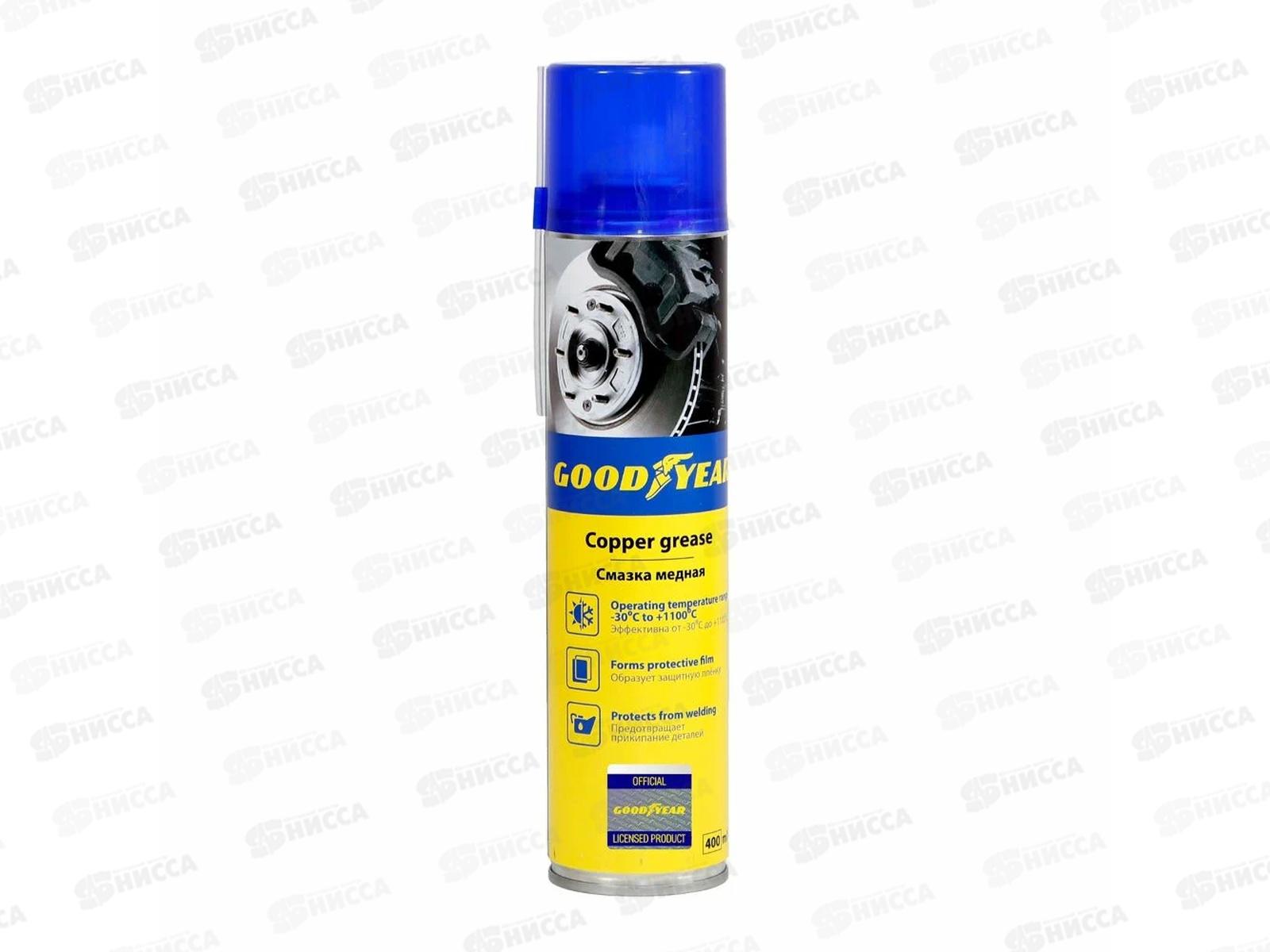 Медная смазка Goodyear аэрозоль, 400 мл GY000719 предназначена для обработки резьбовых соединений и прочих металлических деталей. Эффективна от -30 С до +1100 С. Состав: алифатический растворитель >30%, пропан-бутан >30%, синтетическое масло 5-15%, функциональные добавки 5-15%, ультрадисперсный медный порошок <5%.