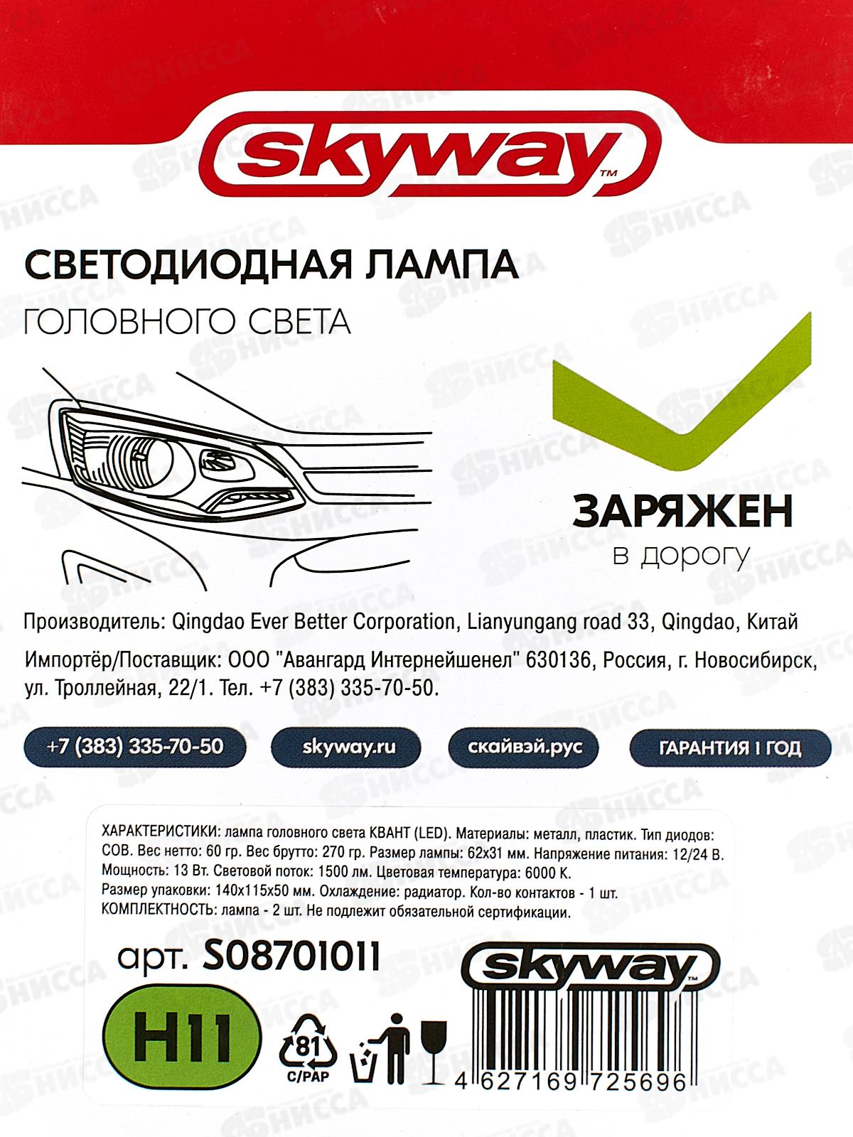 Автолампа-LED (аналог ксенона) H11(MINI) 12/24V 13W 6000K 1500Lm 1-конт SKYWAY комп.2 шт - позволяет водителям значительно улучшить видимость на дороге и увеличить площадь освещаемого участка. Излучает широкий поток света, который просвечивает туман и при этом освещает непосредственно дорожное полотно.