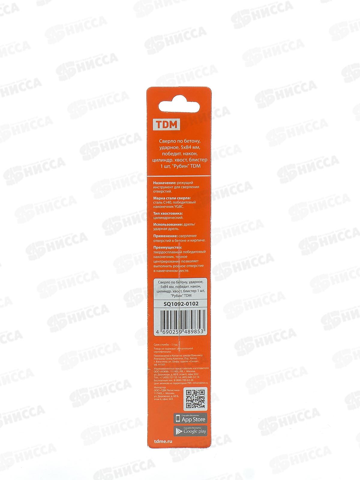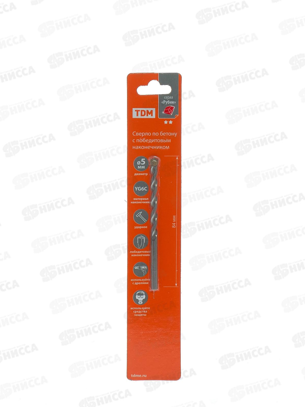 Сверло по бетону, ударное, 5*84 мм, победитовый наконечник цилиндрический хвост, блистер 1 шт, "Рубин" TDM, 0102