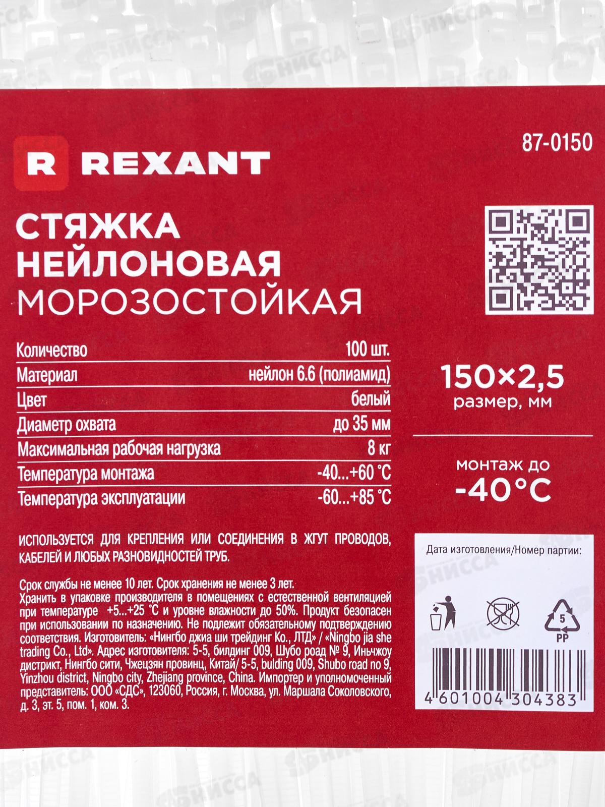 Стяжка нейлоновая морозостойкая 150*2,5мм, белая 100шт, REXANT, 87-0150