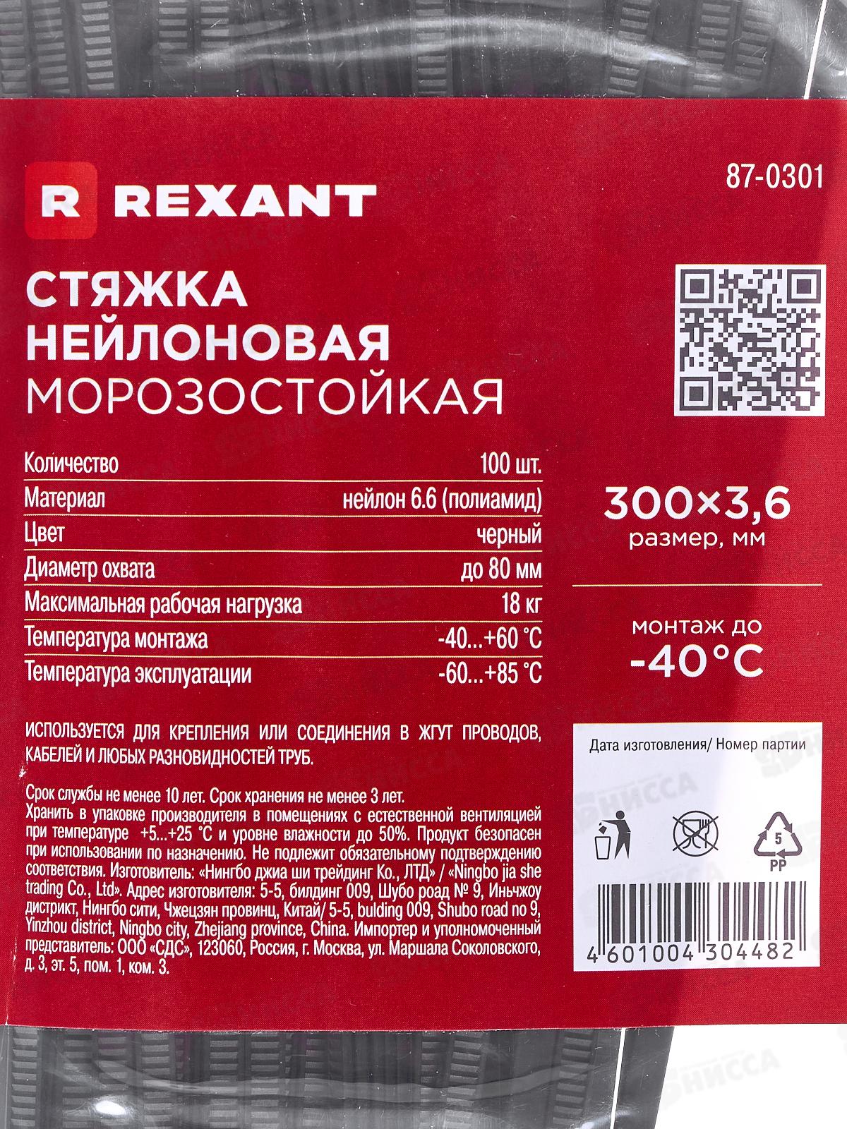 Стяжка нейлоновая морозостойкая 300*3,6мм, черная 100шт, REXANT, 87-0301