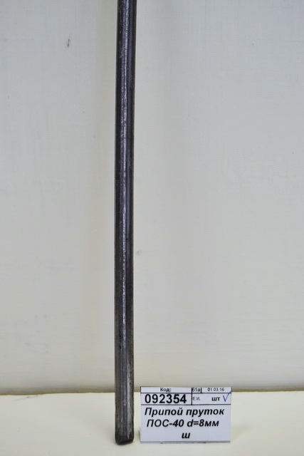 Припой ПОС 40, пруток 8 мм применяется для пайки элементов электроаппаратуры: диодов, транзисторов, конденсаторов, микросхем и др., также припой может использоваться для пайки деталей из оцинкованного железа с герметичными швами, медных проводов и латуни, соединения элементов, подверженных вибрационным нагрузкам. Состав: 40 % содержания олова, 60 % содержания свинца. Припой оптимально подходит в случаях, когда элементы для спайки нельзя перегревать.