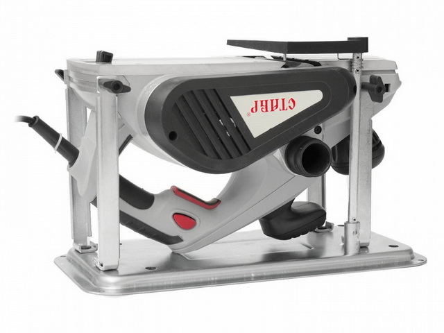 Рубанок электрический СТАВР РЭ-110/1500СТ. Быстрая и удобная трансформация рубанка в полноценный строгальный станок (мод. РЭ-110/1500СТ). Острые ножи из быстрорежущей стали выполняют аккуратную обработку материала. Блокировка кнопки запуска защищает инструмент от случайных включений. Рубанок поставляется с параллельным упором, регулирующим ширину обработки материала. Наличие пылеотвода позволяет сохранять рабочую поверхность чистой. Опорная пята позволяет ставить инструмент на подошву сразу после работы без опасности повреждения обрабатываемой поверхности или строгальных ножей. V-образные пазы на подошве упрощают снятие фасок под углом 45°. Комбинированная рукоятка одновременно выполняет функции дополнительной рукоятки и регулятора глубины строгания. Возможность выборки четверти позволяет осуществить выборку четверти с поверхности (мод. РЭ-110/1500СТ). Комплектация: станина с креплением, параллельный упор, мешок для сбора стружки, ключ для установки строгальных ножей, устройство для правки ножей, упор-фиксатор выключателя, возвратный кожух для защиты строгальных ножей упор для выборки четверти (фальца).