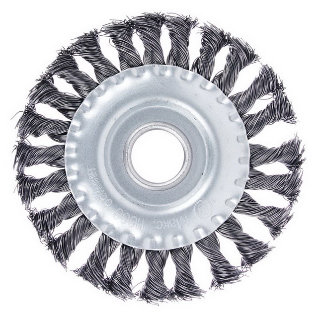 Щетка металлическая изготовлена из стальной крученой проволоки. Такая щетка имеет высокую износостойкость и применяется при грубых зачистных работах по металлическим поверхностям, удалении окалины, ржавчины и заусенцев, сглаживании сварных швов.