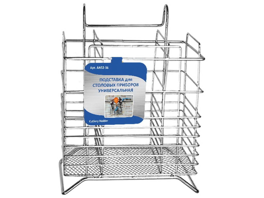 Подставка для столовых приборов удобна в применении, среди достоинств изделия: оптимальный размер, подходящий для больших и маленьких кухонь; изготовлена из стальной хромированной проволоки, устойчива к воздействию влаги, длительное время сохраняет блеск; имеет удобные ножки для устойчивости на горизонтальной поверхности и петли для крепления на рейлинг. Универсальное приспособление подойдет практически под любой интерьер, может использоваться как дома, так и на даче.