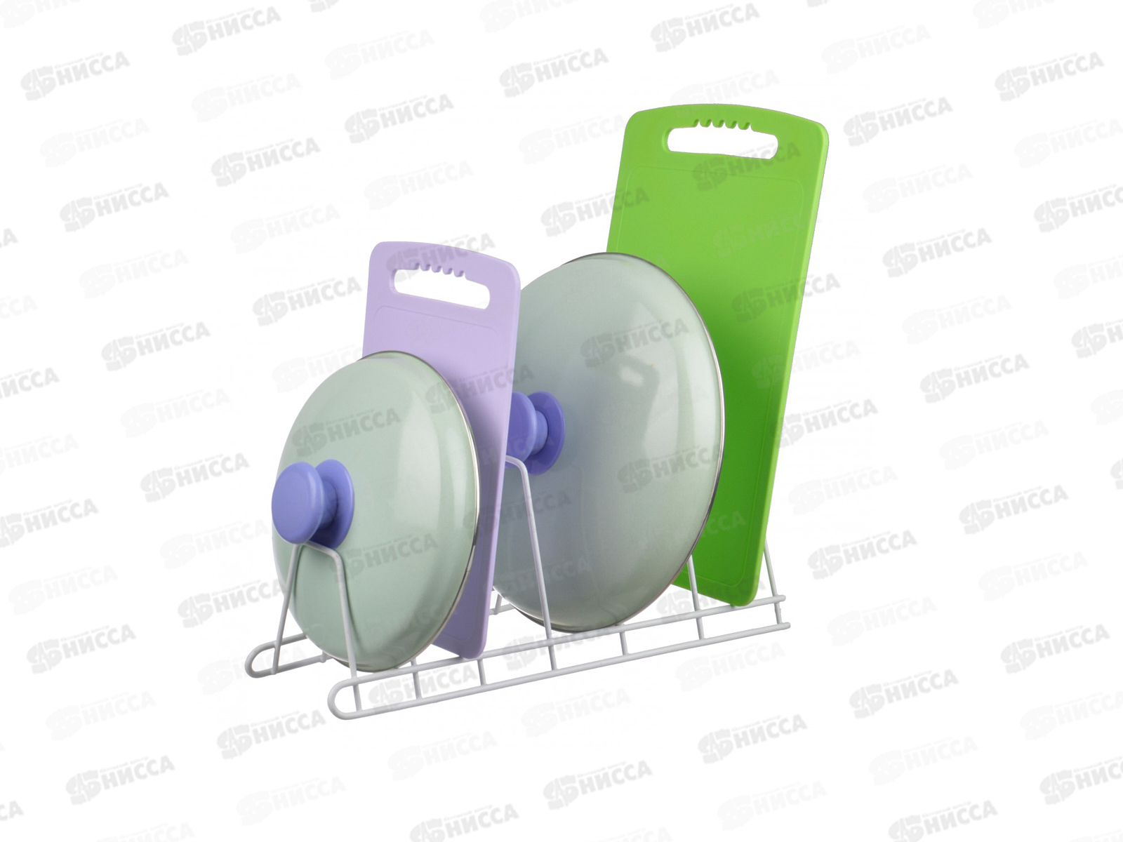 Подставка для крышек. Изготовлена из металлической проволоки с полимерным покрытием, которое предохраняет изделие от коррозии. Предназначена для удобного хранения крышек разного диаметра от кухонной посуды на кухне. При уходе за изделием следует применять неабразивные моющие средства.