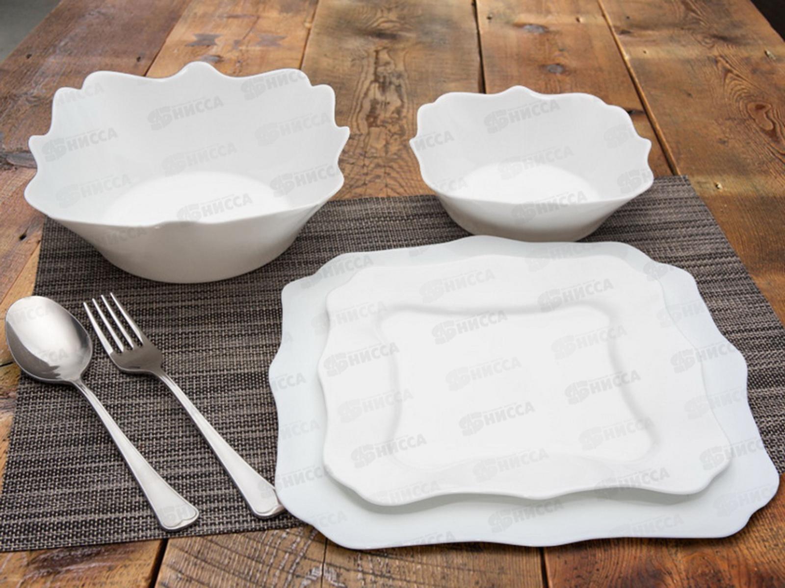 Такую посуду можно разогревать в микроволновой печи, мыть в посудомоечной машине и ставить в холодильную камеру. Форма тарелок – квадратная с резным краем. Состав набора: тарелка плоская квадратная 21х21 см - 6 шт, тарелка плоская квадратная 26х26 см, салатник квадратный 16х16 см - 6 шт, салатник квадратный 20х20 см - 1 шт.