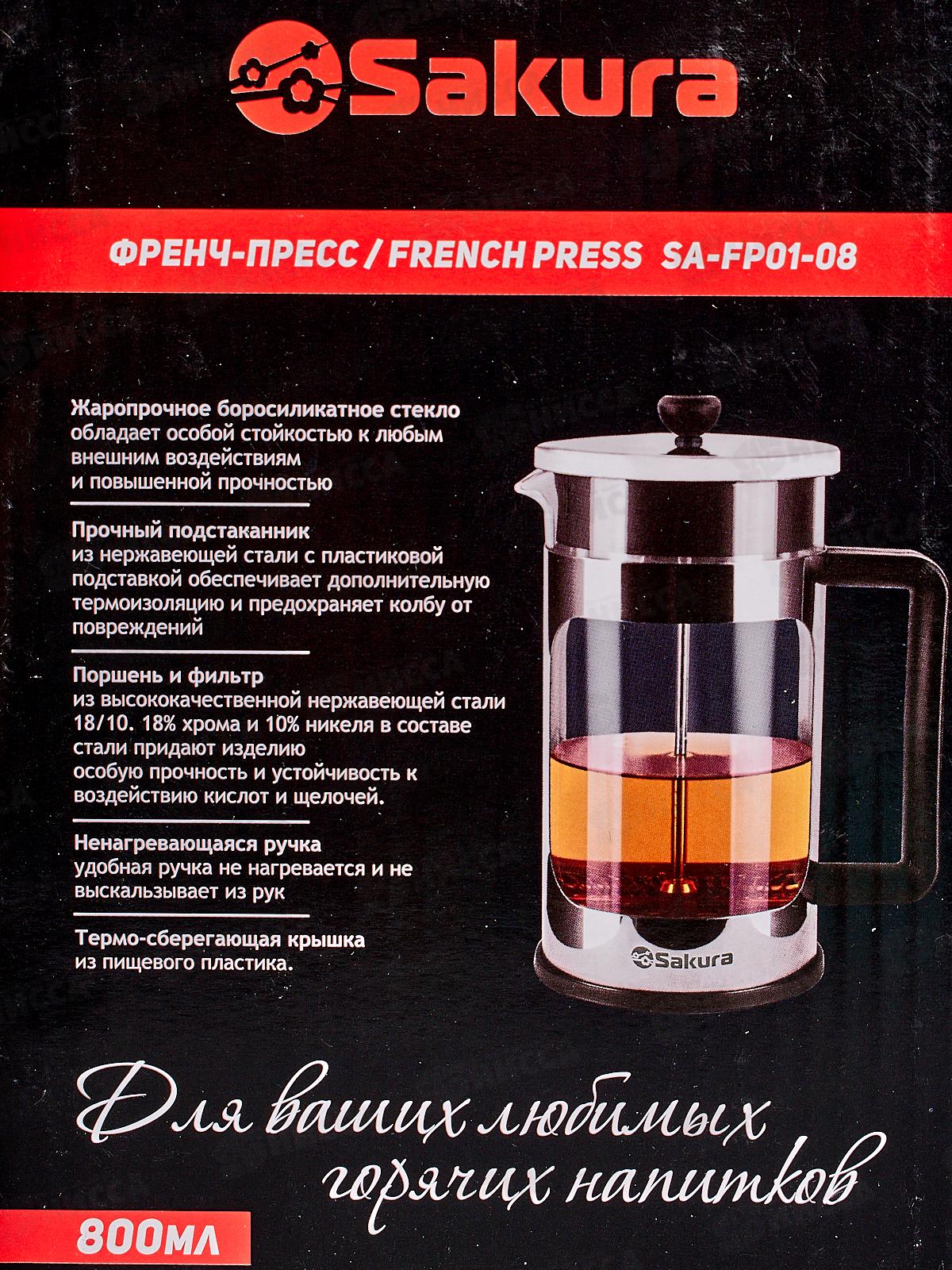 Объем 850мл; материал боросиликатное стекло, нержавеющая сталь, пластик. Френч-пресс изготовлен из жаропрочного боросиликатного стекла, с фильтрующим поршнем из нержавеющей стали, пластиковая ручка и крышка хром. Подходит для заваривания кофе и чая. Посл