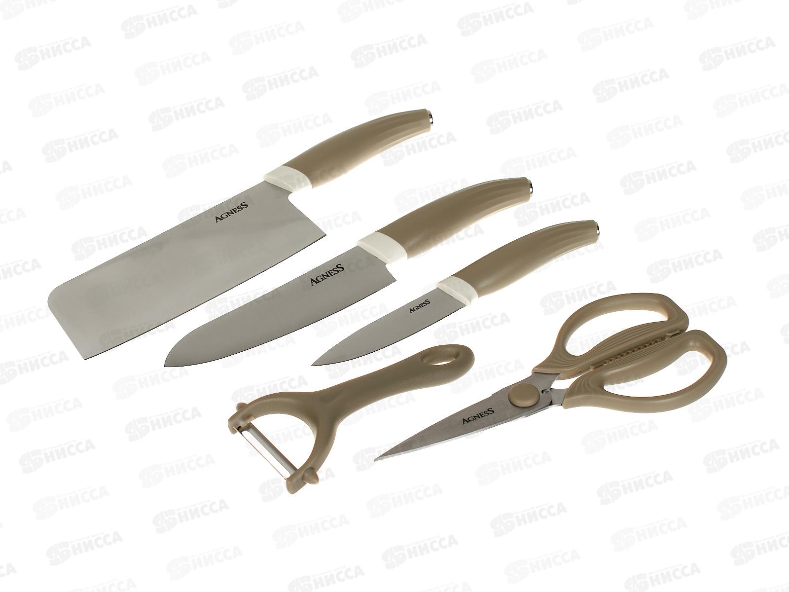 Состав набора: нож для нарезки 28 см, нож сантоку 26 см, нож для овощей и фруктов 21 см, овощечистка 14 см, ножницы кухонные 21 см, подставка 25х9,2х18,8 см, разделочная доска 38х28х0,8 см.