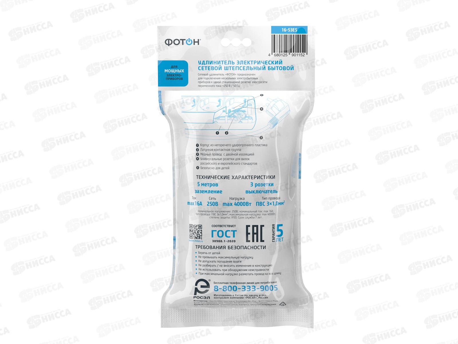 Удлинитель ФОТОН 16-53ES 5м 3розетки 16А выключатель, с заземлением, белый *20