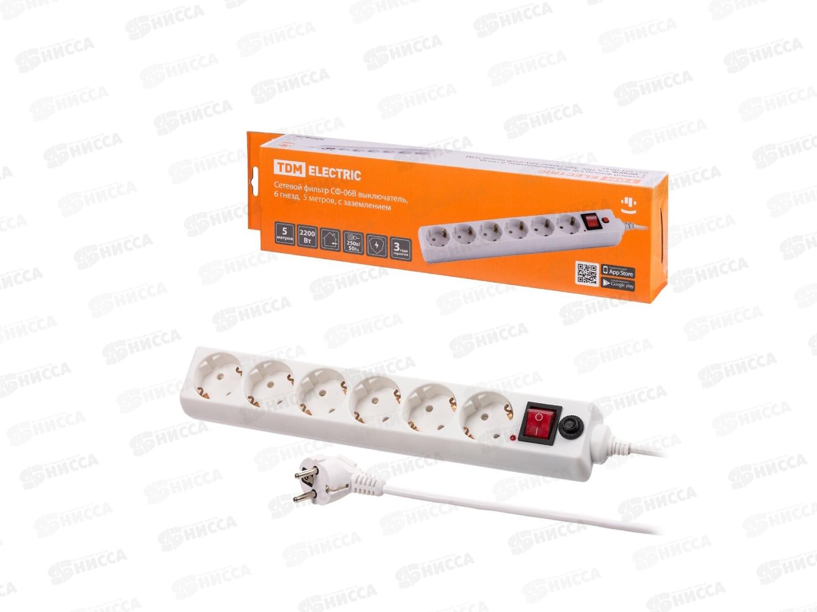 Сетевой фильтр TDM СФ-06В с выключателем, 6гнезд, 5м, с/з, ПВС 3*0.75кв.мм, 0021 *20