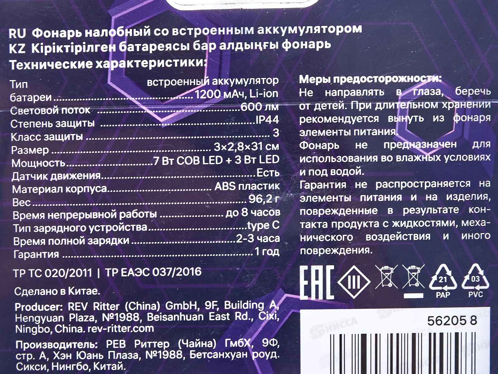 Фонарь налобный LED COB 7 Вт,1200мАч 600Лм, Ritter, 56205 8