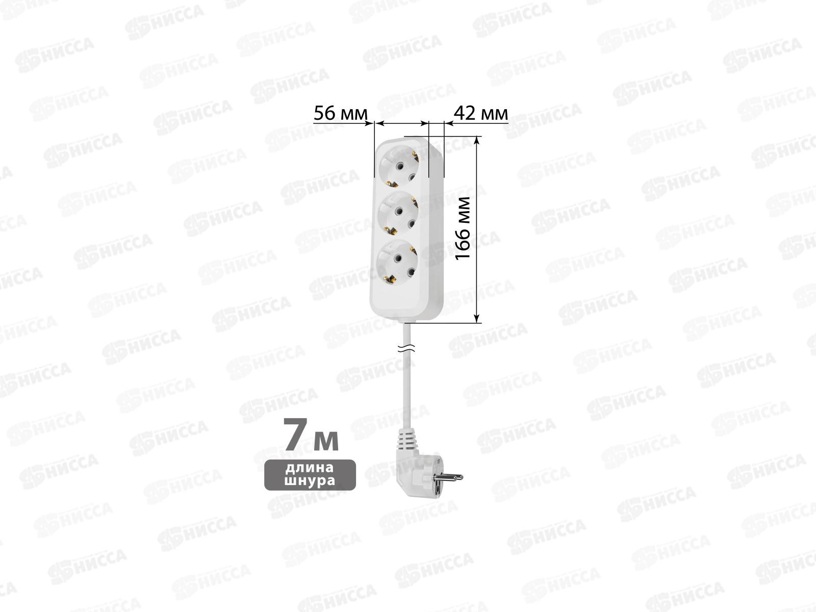 Удлинитель 3 гнезда, 7 метров, без заземления, 10 А, 2300 Вт, белый, Народный 1313 *34