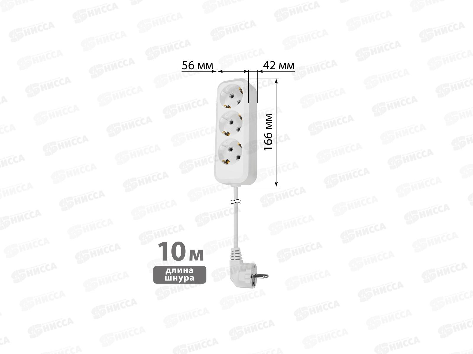 Удлинитель 3 гнезда, 10метров,с заземления, 10А, 2300Вт, белый, Народный, 1044