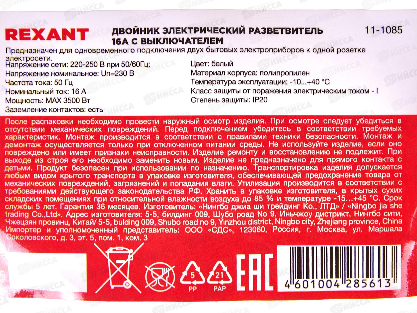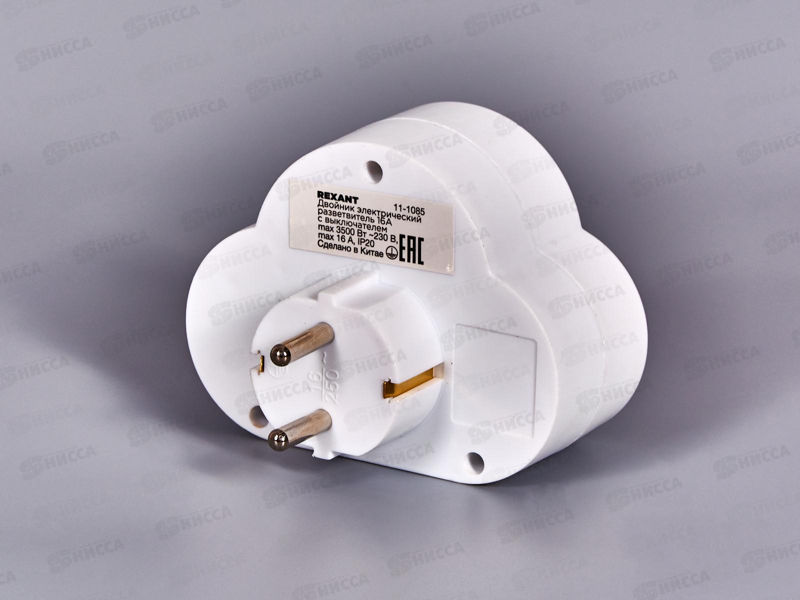 Двойник Rexant 16А с заземлением, с выключателем белый, 11-1085 *100