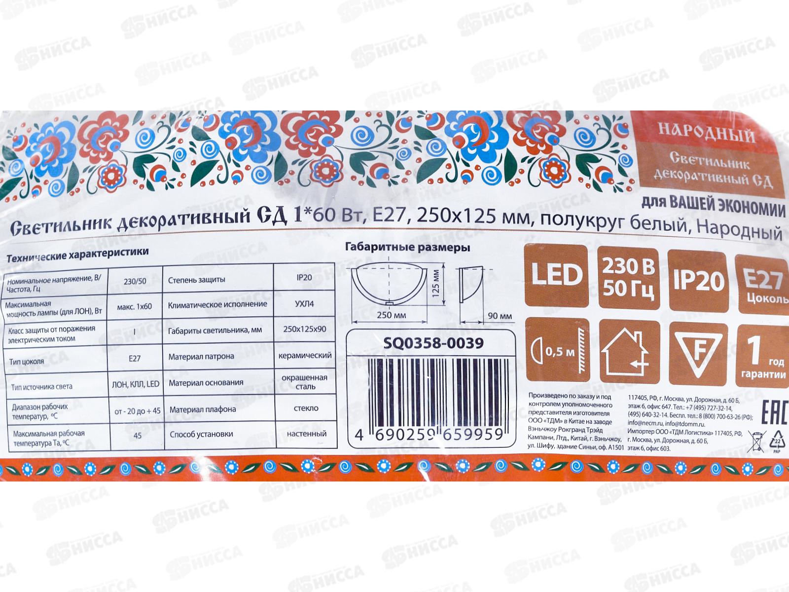 Светильник декоративный СД 1*60Вт, E27, 250*125мм, полукруг, белый, Народный, 0039 *18/36