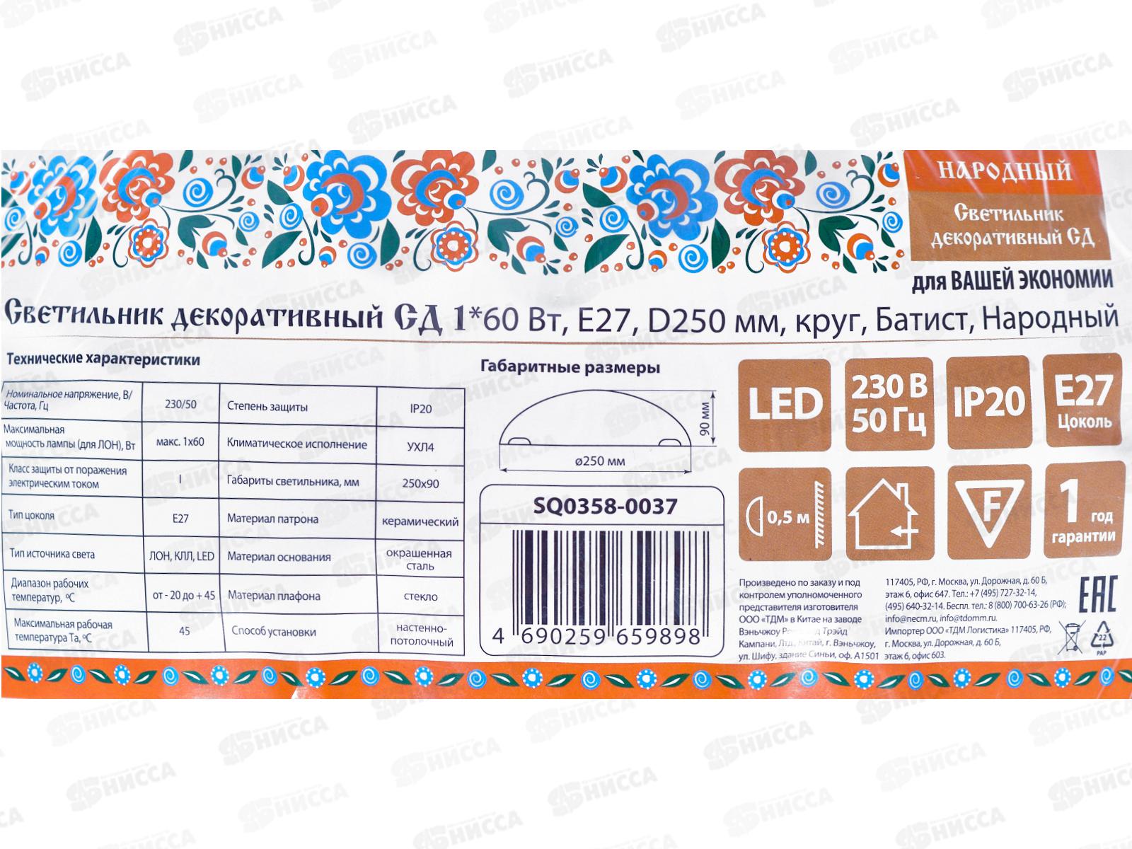 Светильник декоративный СД 1*60Вт, E27, D250мм, круг, Батист, Народный, 0037 *24