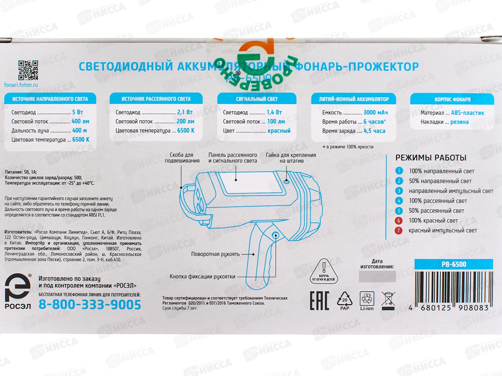 Фонарь-прожектор аккумуляторный светодиодный ФОТОН, PB-6500