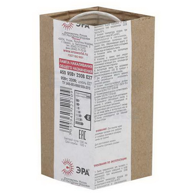 • Электрическая лампочка  95 Вт ЭРА E27, А50 в гофрированной упаковке *100
