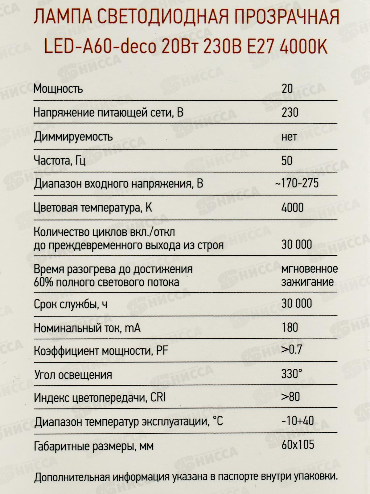 Лампа светодиодная IN HOME LED-A60-deco 20Вт E27 4000К 990Лм *50
