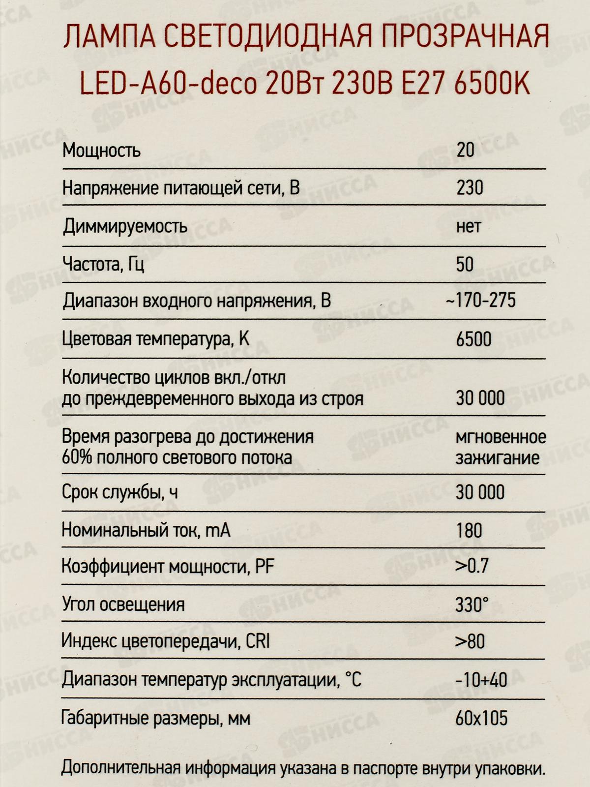 Лампа светодиодная IN HOME LED-A60-deco 20Вт E27 6500К 990Лм *50