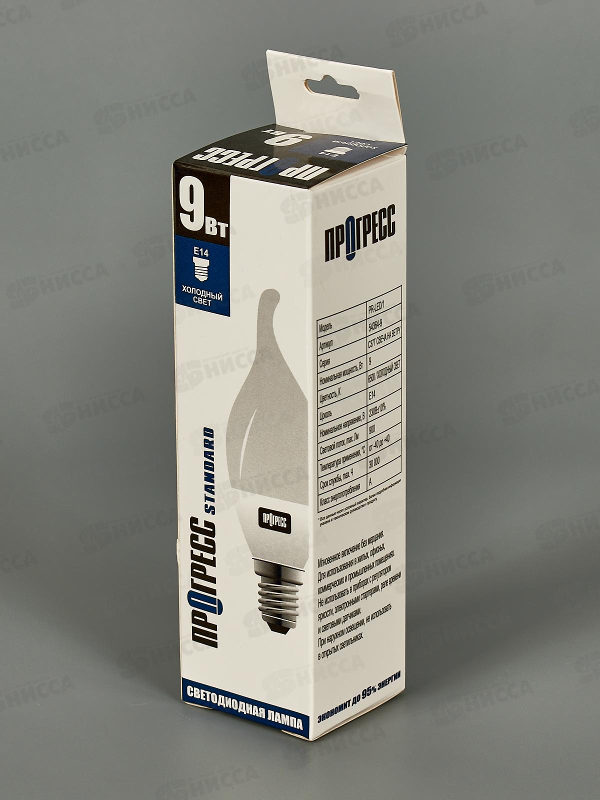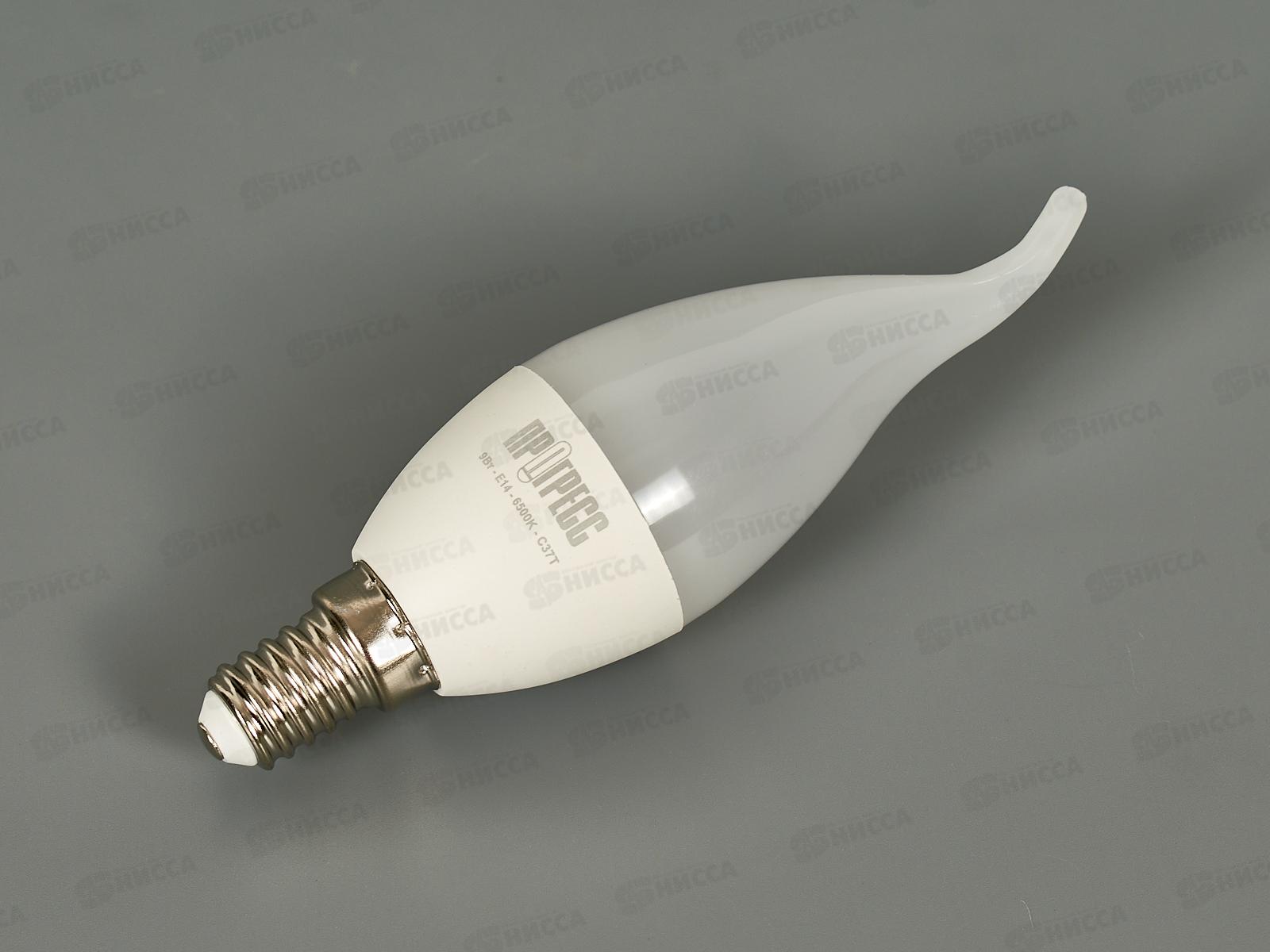 Лампа светодиодная Прогресс Standard 9Вт E14 C37T 6500К- яркий белый свет *10/100