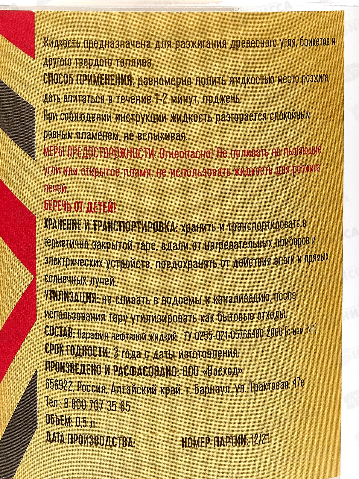 Жидкость предназначена для разжигания древесного угля, дров, брикетов и другого твердого топлива. Способ применения: Равномерно полить жидкостью место розжига. Дать впитаться в течении 1-2 минут, поджечь. При соблюдении инструкции жидкость разгорается спокойным ровным пламенем, не вспыхивая. Внимание: не поливать на пылающие угли и открытое пламя, не использовать жидкость для розжига печей.