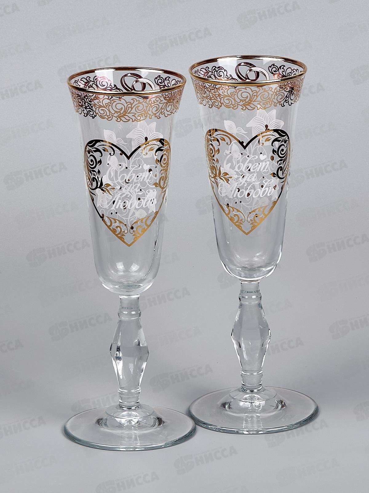 Подарочный набор "Лилия" из серии "Совет да любовь", из двух бокалов. Коробка с вырезом в виде сердца. Бокалы закреплены на ложементе, обтянутом красным атласом. На бокалах золотой деколью нанесены изображения купидонов, обращённых друг к другу. На оборотной стороне бокалов нанесено поздравление: Совет да Любовь. По верху бокала нанесён золотой узор и отводка края золотом.