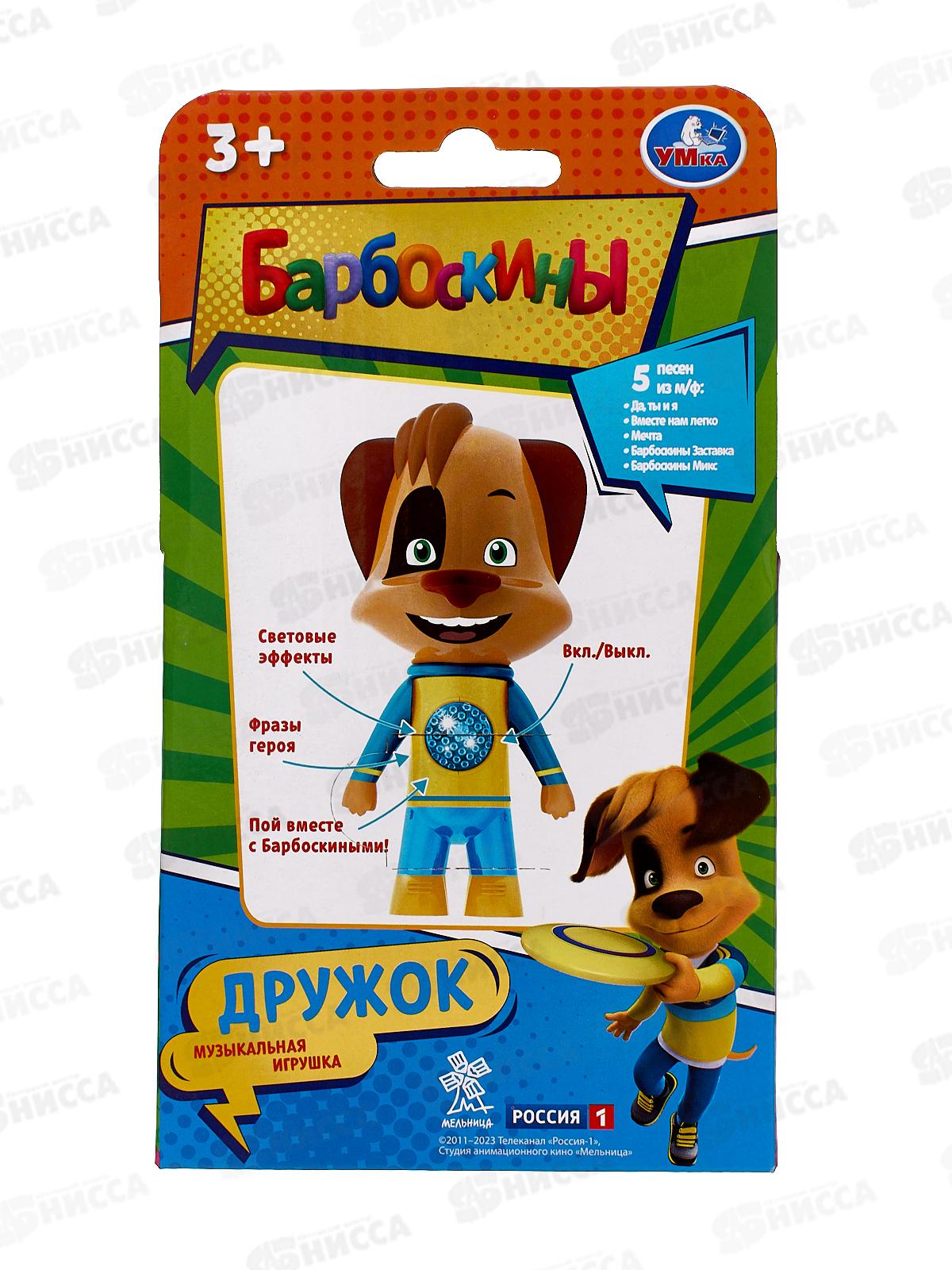 Музыкальная игрушка «Барбоскины. Дружок» ТМ «УМка» станет прекрасным подарком для маленьких поклонников мультсериала про весёлую семью собак: - 5 песен из м/ф (фрагменты): «Да, ты и я», «Вместе нам легко», «Мечта», «Барбоскины Заставка», «Барбоскины Микс», - фразы героя, - световые эффекты.