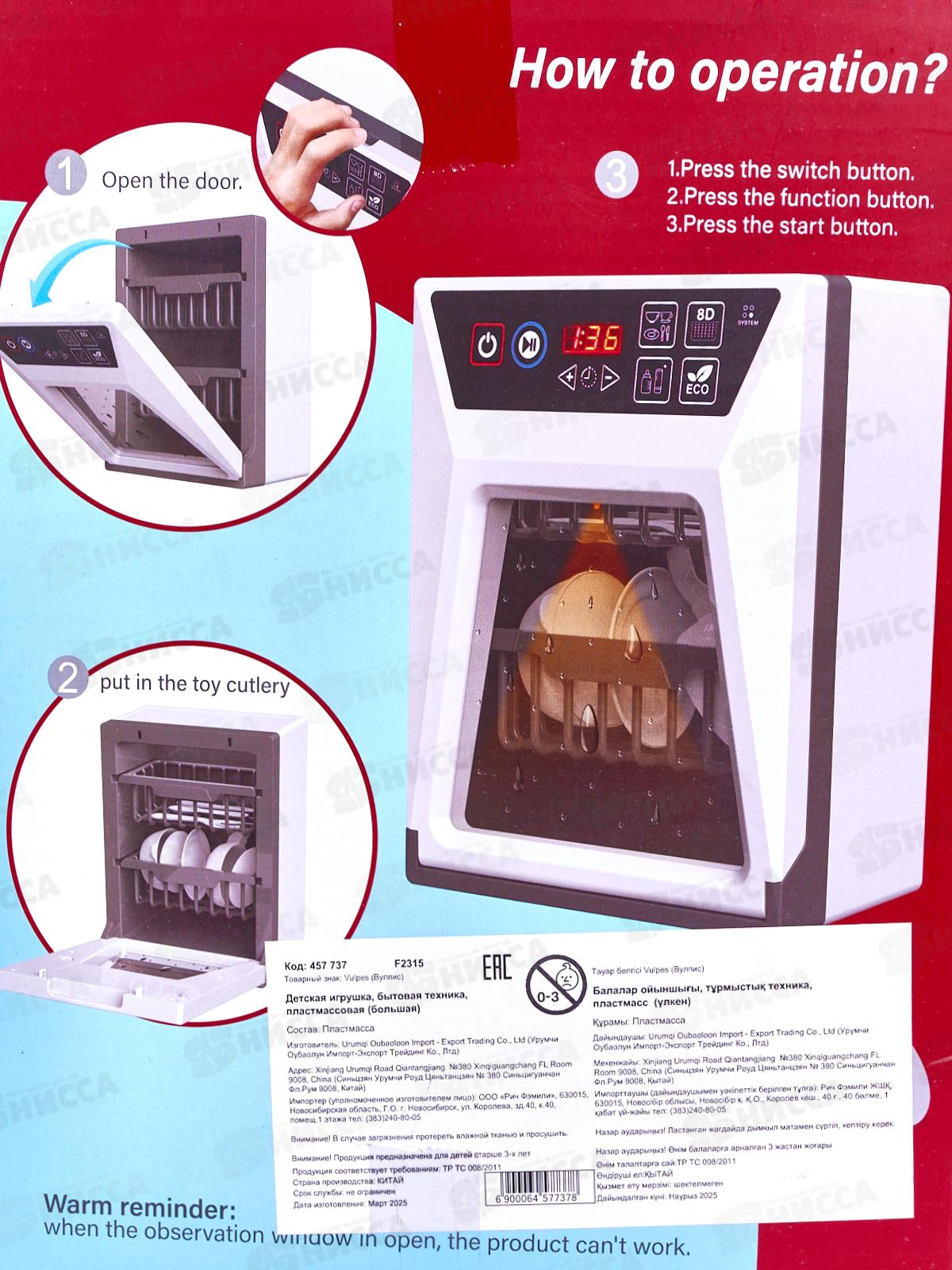 Игрушечная посудомоечная машина – это чудесный способ для вашего малыша почувствовать себя настоящим помощником! Очаровательная миниатюрная копия настоящей бытовой техники подарит ребенку яркие впечатления. При выборе программы, она начнет “мыть” посуду, а дисплей будет показывать, сколько осталось до окончания цикла мытья. Звуки работы посудомойки придают ощущение натуральности процесса, что вызывает еще больший интерес у ребенка.