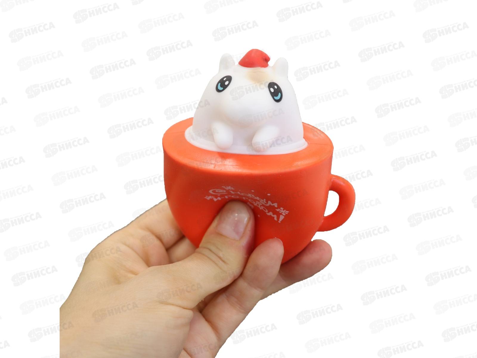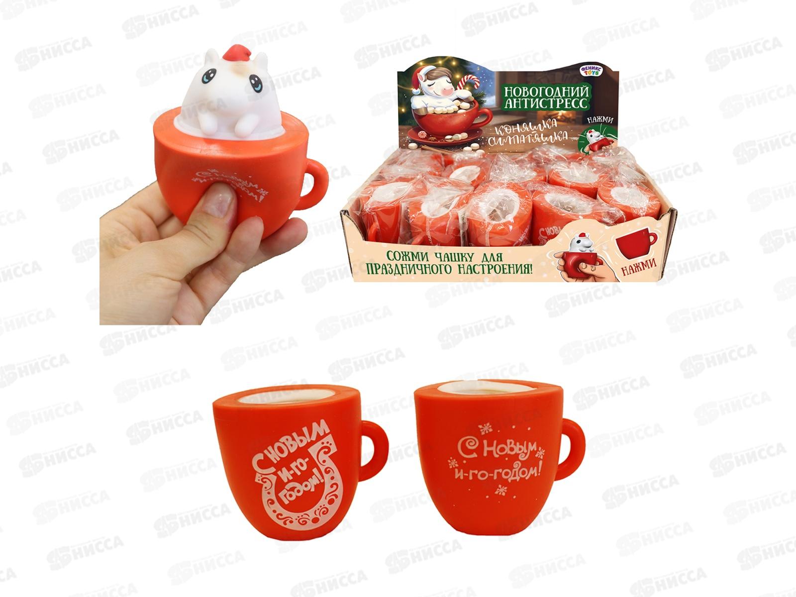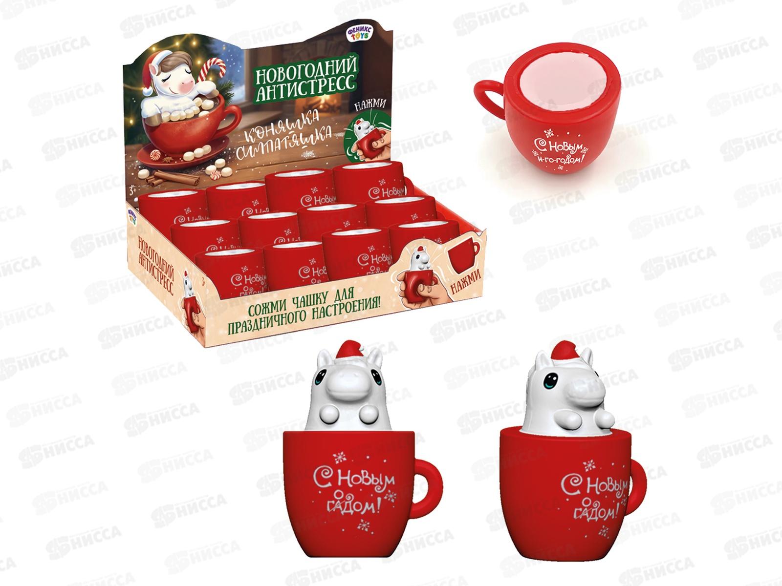 Особенности: антистресс-мялка в виде кружки, при нажатии на которую из неё вылезает голова лошадки в новогоднем колпачке.
