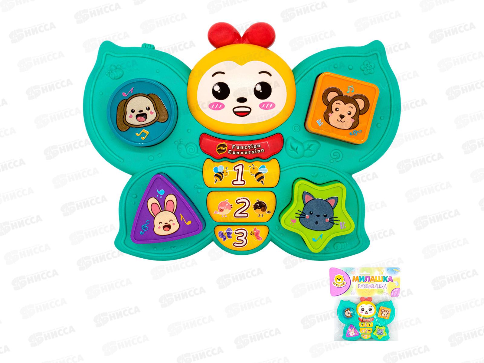 Особенности: игрушка выполнена в виде бабочки, на крыльях 4 больших разноцветных фигуры с рисунками животных, 4 клавиши разных размеров с цифрами и рисунками. Нажимая на клавиши игрушка издает звуковые эффекты, 2 уровня громкости, световые эффекты.