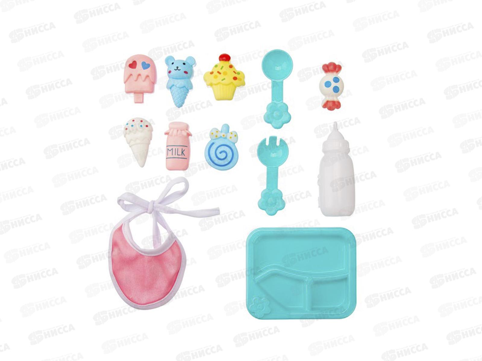 В наборе есть самые необходимые аксессуары для ухода за малышом – бутылочка для кормления, слюнявчик, тарелка с ложкой и вилкой, и целый набор игрушечных сладостей. Пупса можно купать, переодевать и укладывать спать.