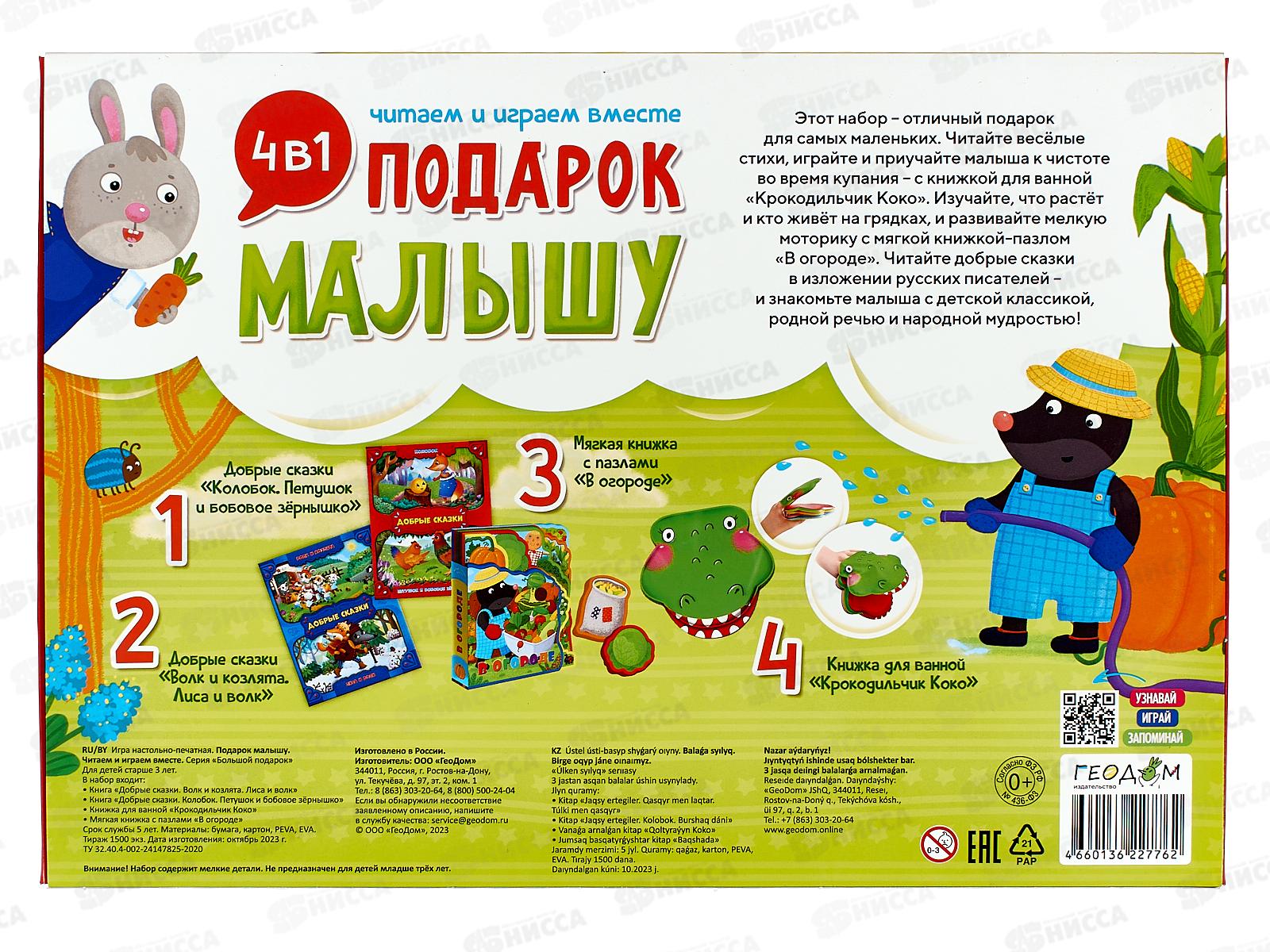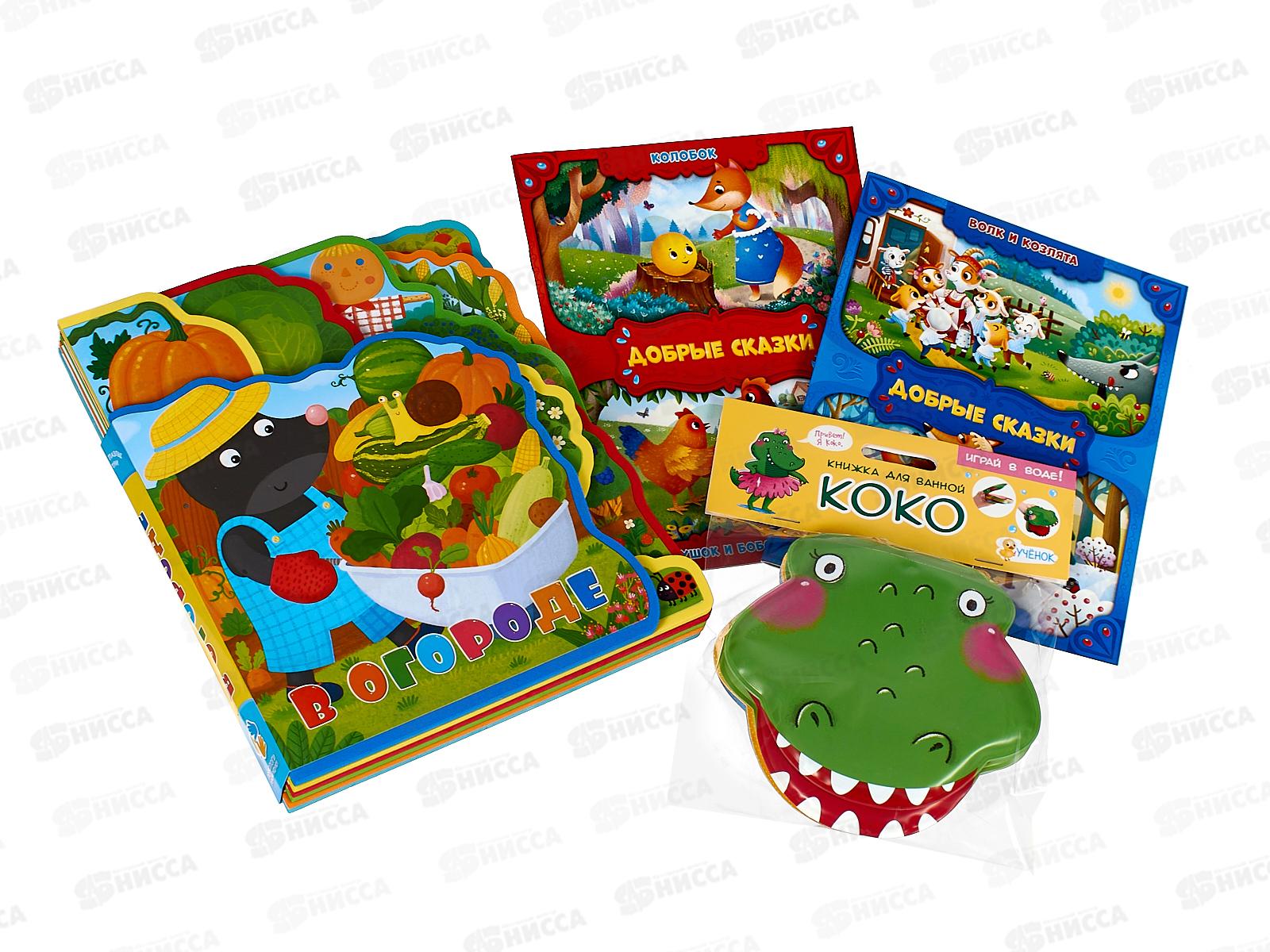 В состав набора входят: книжки 2 в 1 "Колобок/Петушок и бобовое зёрнышко", "Волк и лиса/Лиса и козлята", книжка-игрушка для ванной "Крокодильчик Коко", мягкая книжка ЭВА с пазлами "В огороде".