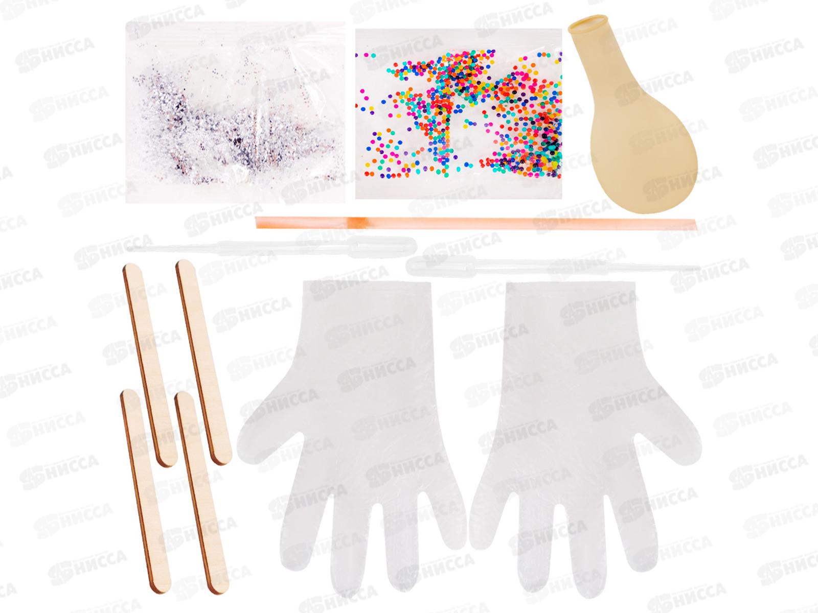 В комплекте: 3 баночки с клеем, краситель, ароматизатор, глицерин, тетраборат натрия, шарики орбиз, блестки, 3 палочки, 2 пипетки Пастера, перчатки, трубочка, воздушный шарик.