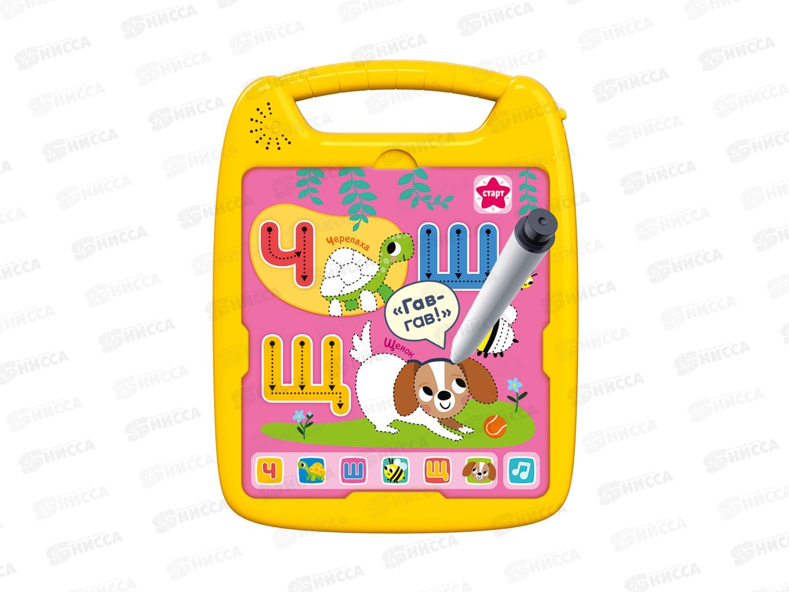 Ребёнок с удовольствием будет обводить и раскрашивать картинки с буквами, слушая при этом забавные звуки и мелодии. Их в планшетике 150. Такое интерактивное рисование увлечёт вашего непоседу надолго. Ведь в комплекте 11 сменных экранчиков. Рисовать на них можно как фломастером, входящим в набор, так и любыми фломастерами на водной основе. А ещё рисунки можно стирать и рисовать снова