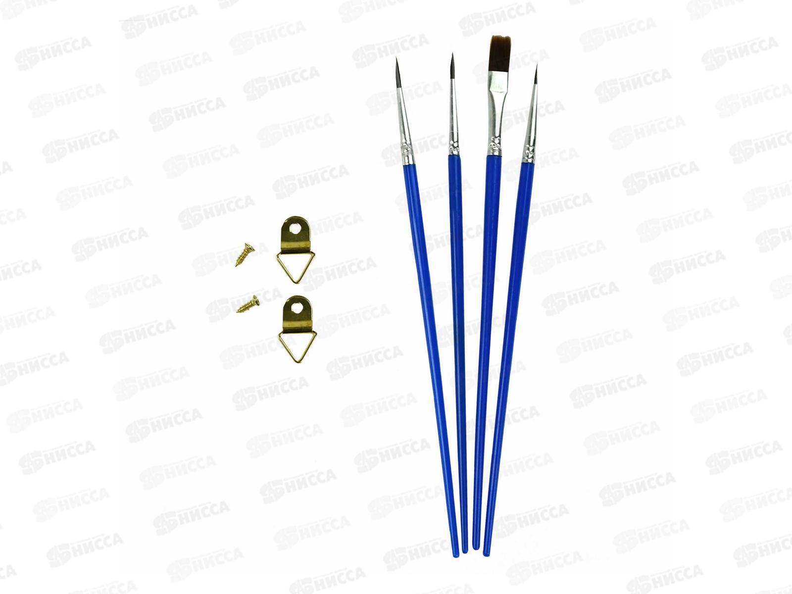 Комплектность: холст с напечатанной схемой рисунка, краски акриловые на водной основе, кисти художественные с ворсом из нейлона – 4 шт, деревянные держатели с подвесом, контрольный лист с нанесенной схемой.