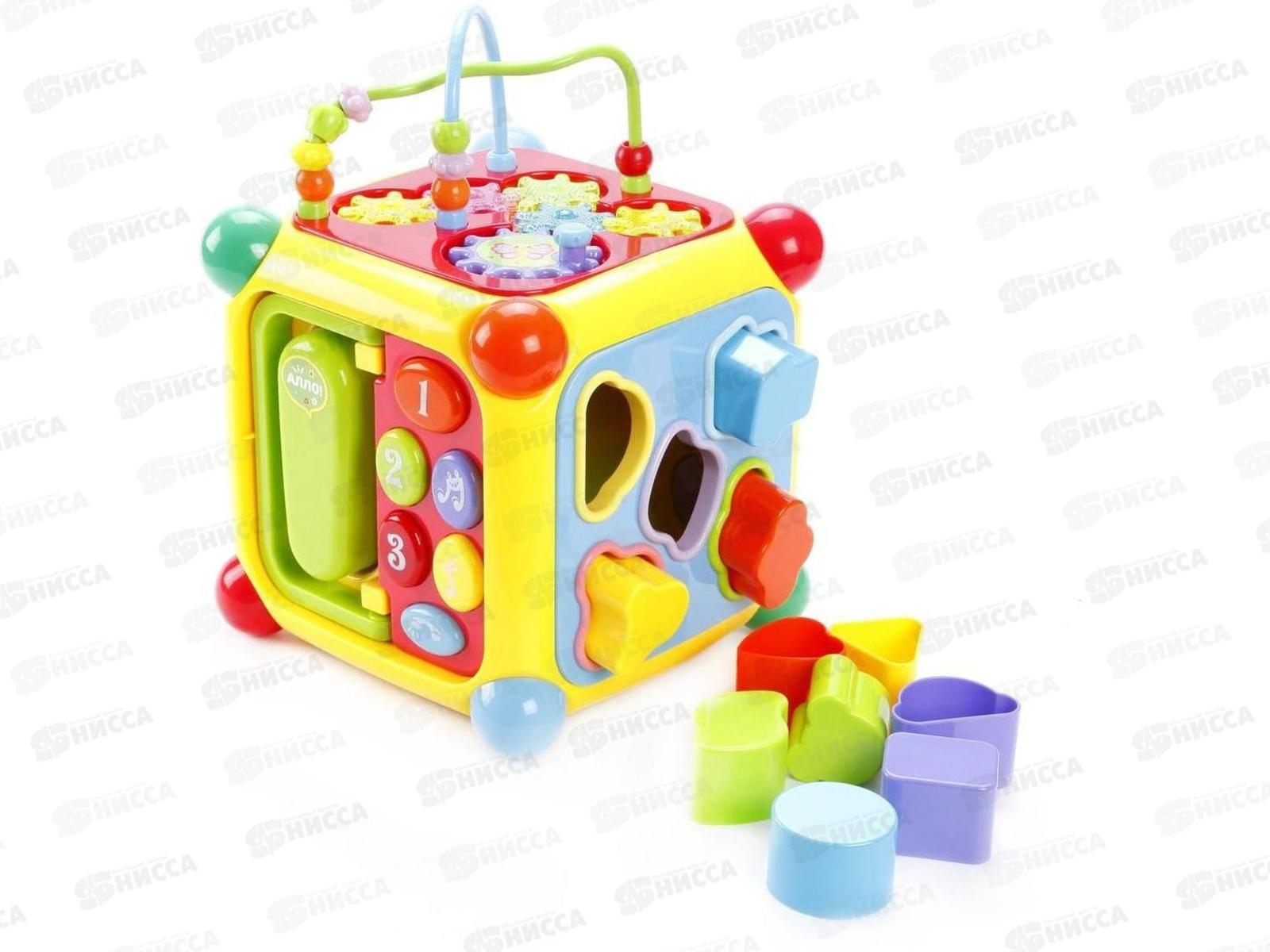 Это настоящий многофункциональный игровой центр! На каждой стороне куба — разные развивающие игры. На двух сторонах расположены сортеры — фигурные отверстия, через которые малыш должен протолкнуть внутрь куба фигурные элементы. На третьей стороне — игрушка-лабиринт с разноцветными колечками и шестеренки, которые можно вращать. Четвертая сторона — это телефон для малышей с большими кнопками. Игра с телефоном сопровождается различными звуками и мелодиями, звук включается с помощью кнопки on/off, расположенной на этой же стороне. Здесь же есть складная ручка для переноски куба. Пятая сторона — музыкальное пианино со своим отдельным переключателем питания on/off. У пианино — пять клавиш разного цвета и четыре функциональных кнопки с изображением музыкальных инструментов. При нажатии на функциональные кнопки звучание пианино становится похожим на звучание соответствующего музыкального инструмента. Еще одна кнопка в виде ноток, расположенная здесь же, включает режим проигрывания мелодий. Шестая сторона — это дверца, с помощью которой куб можно открывать. Дверца открывается ключиком, присоединенным к этой же стороне с помощью веревочки.