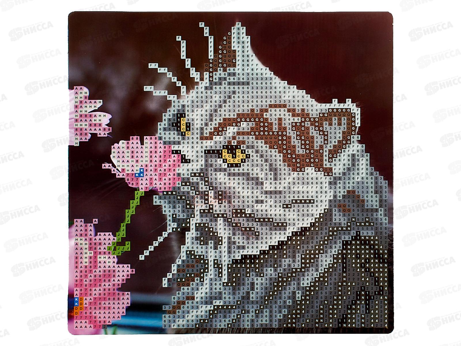 Алмаз. мозаика (класс.) 20х20см Серый кот с цветком НД-0891 на картоне