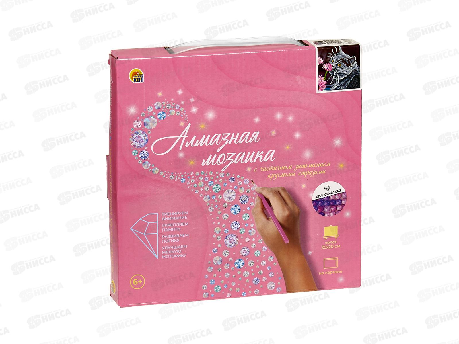 Состав набора: самоклеящаяся основа на картоне размером 20х20 см, стразы, контейнер для страз, карандаш-стилус, клеевая подушка, крепеж, схема.