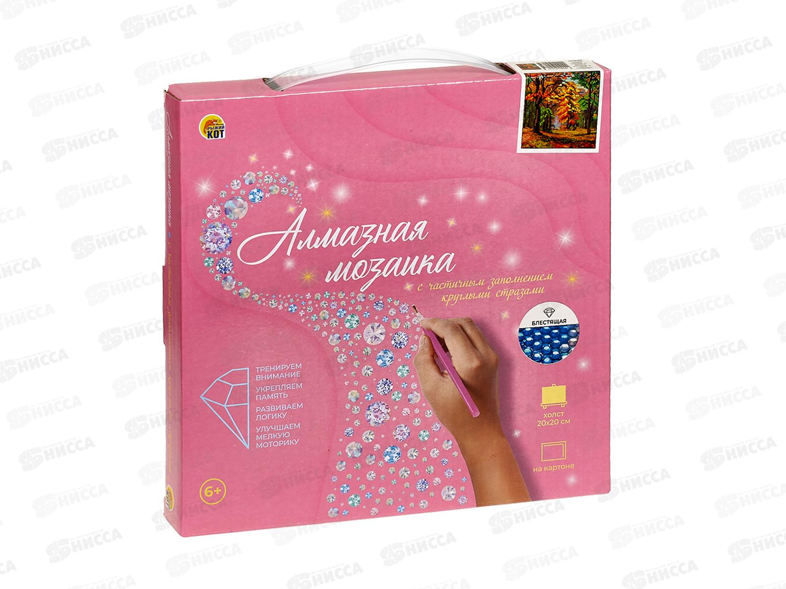 Состав набора: самоклеящаяся основа на картоне размером 20х20 см, стразы, контейнер для страз, карандаш-стилус, клеевая подушка, крепеж, схема.