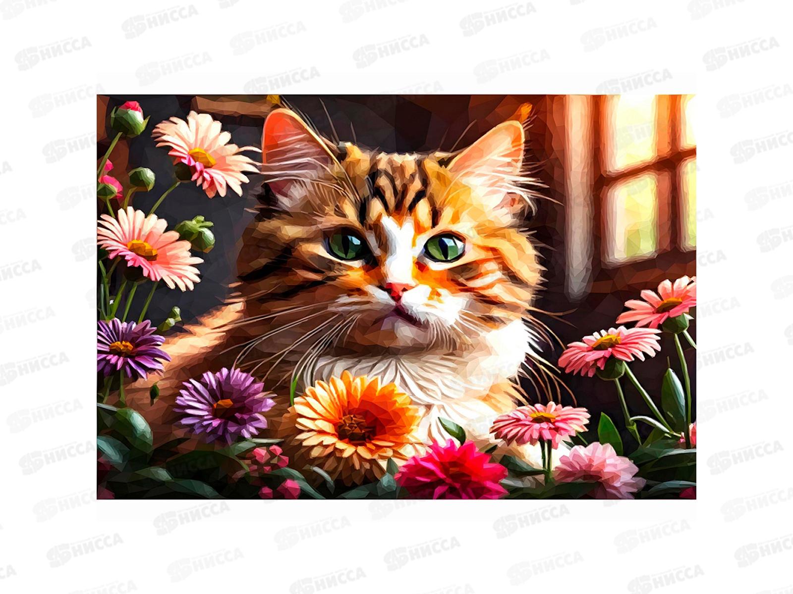 Алмаз. мозаика (квадрат.) 17х22см Портрет котика в цветах, НД-0782 с подр.