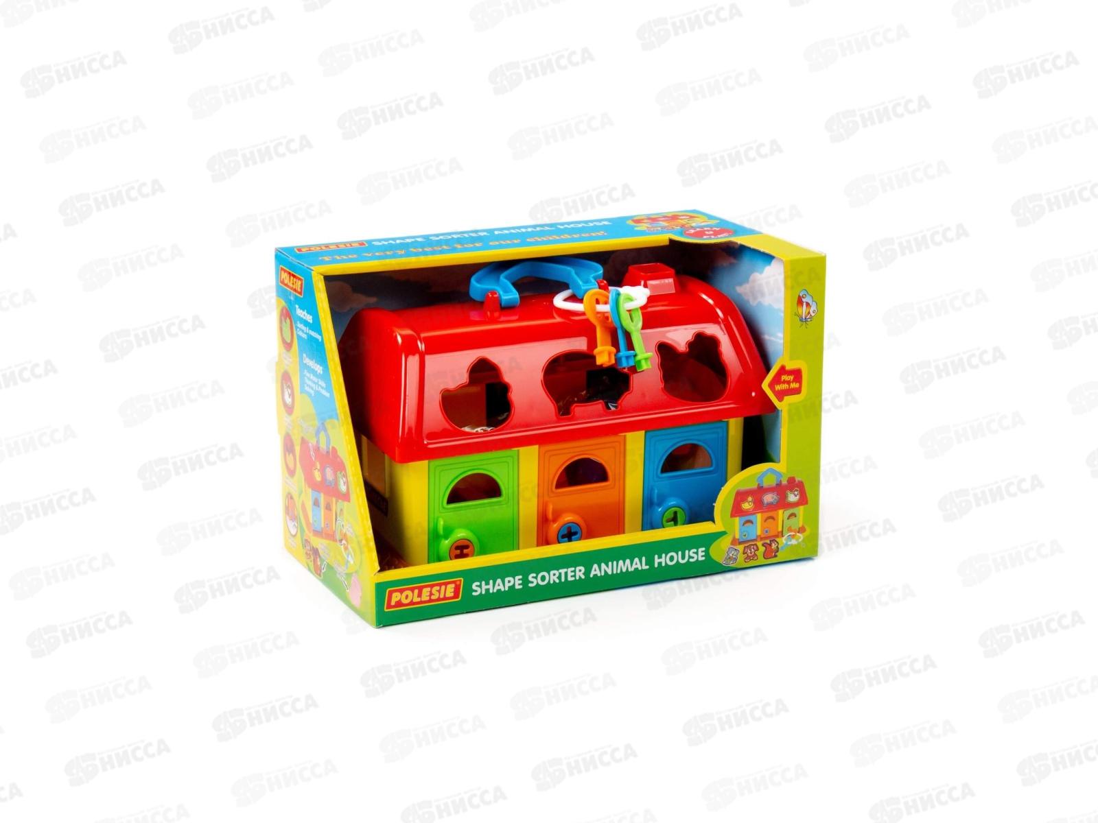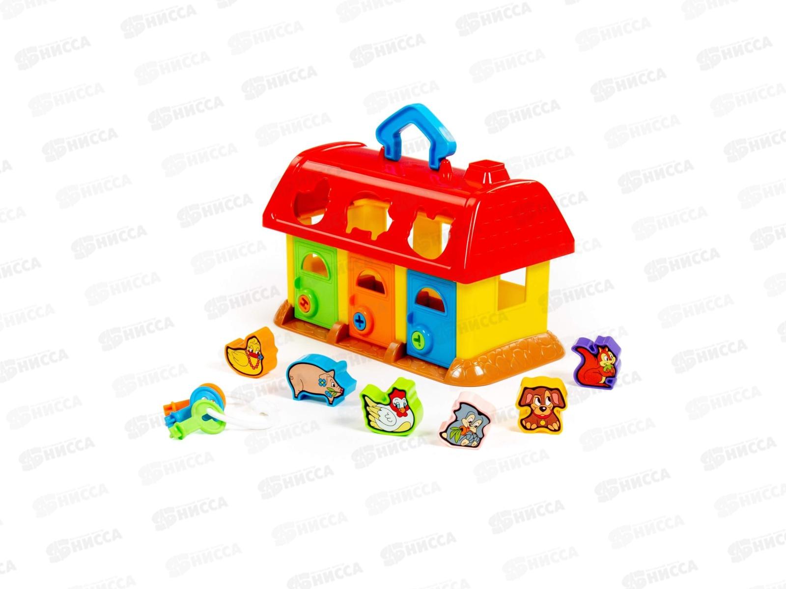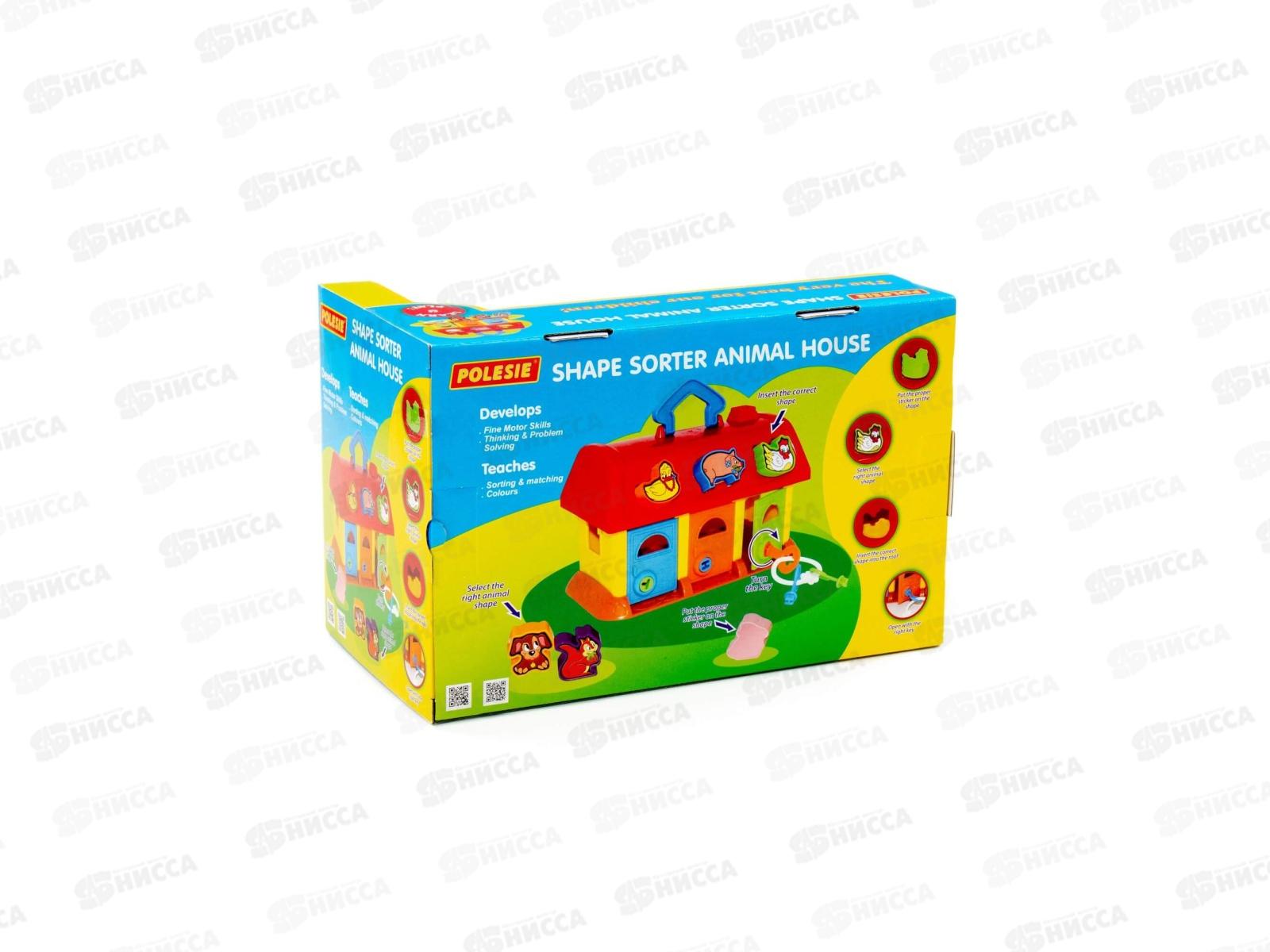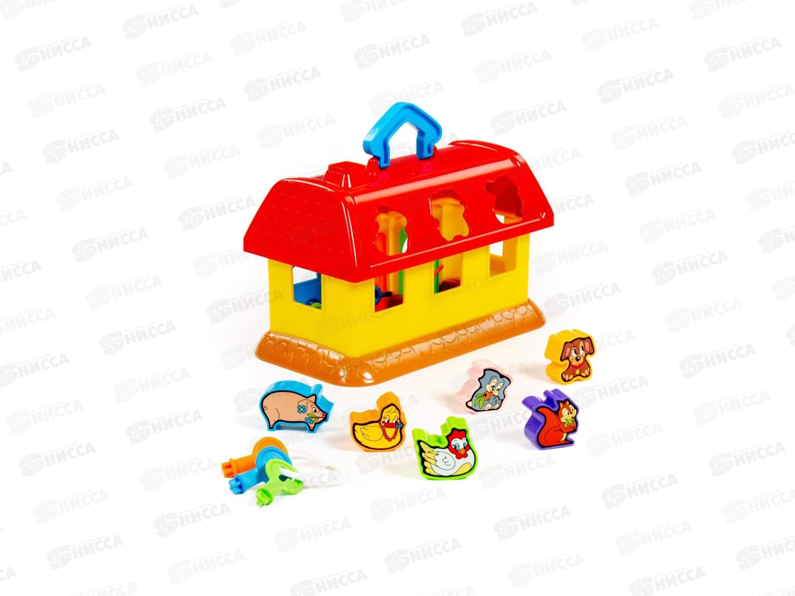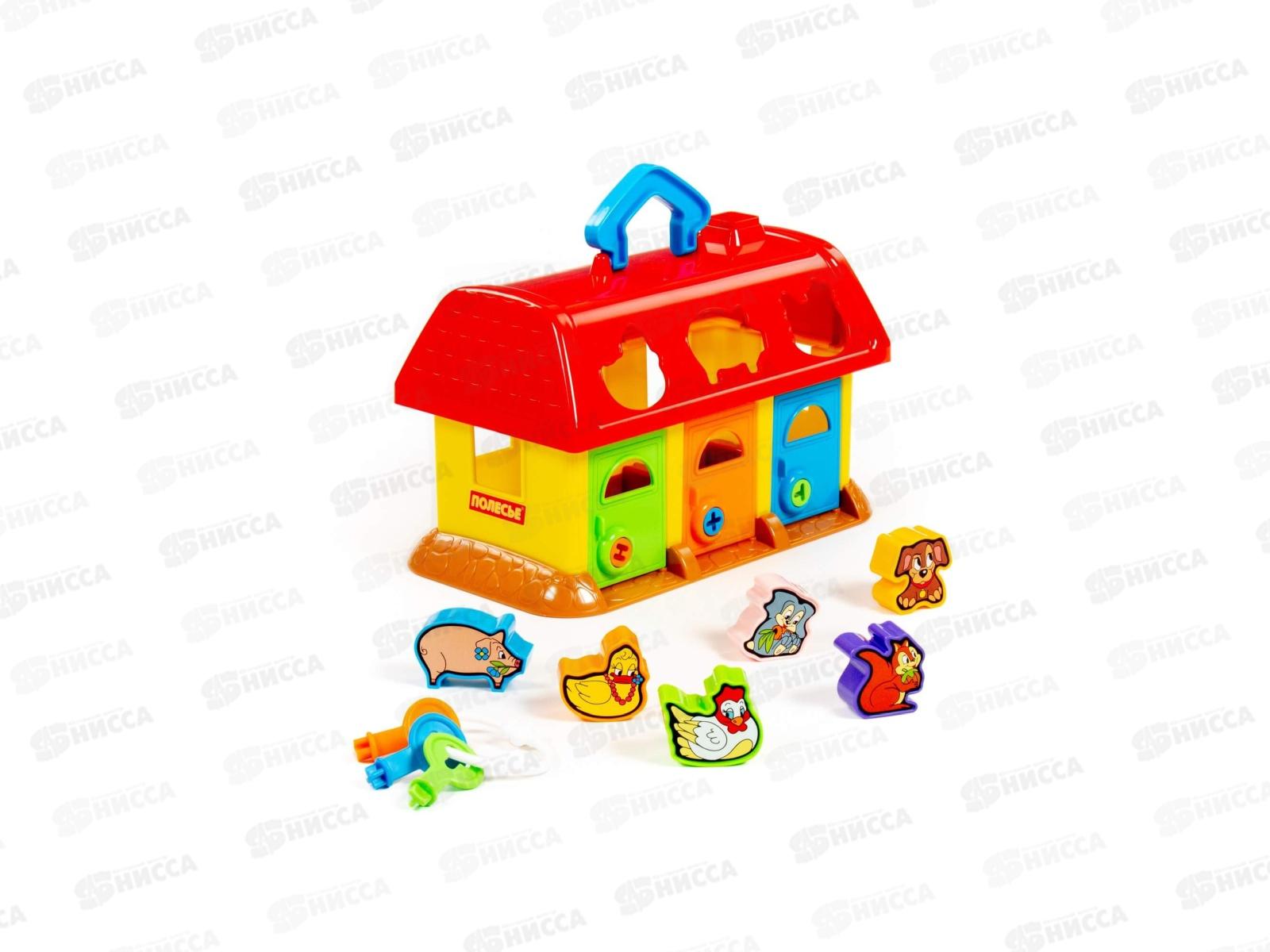 На крыше домика 6 отверстий-пазлов в форме разных зверюшек, куда малыш подбирает и вкладывает соответствующие фигурки. У домика есть 3 дверки с замками, и чтобы открыть их и достать зверюшек, ребенок подбирает ключики по цвету и форме замка. Наклейки с животными на фигурки малыш наклеит сам. На крыше предусмотрена ручка для удобства перемещения домика.